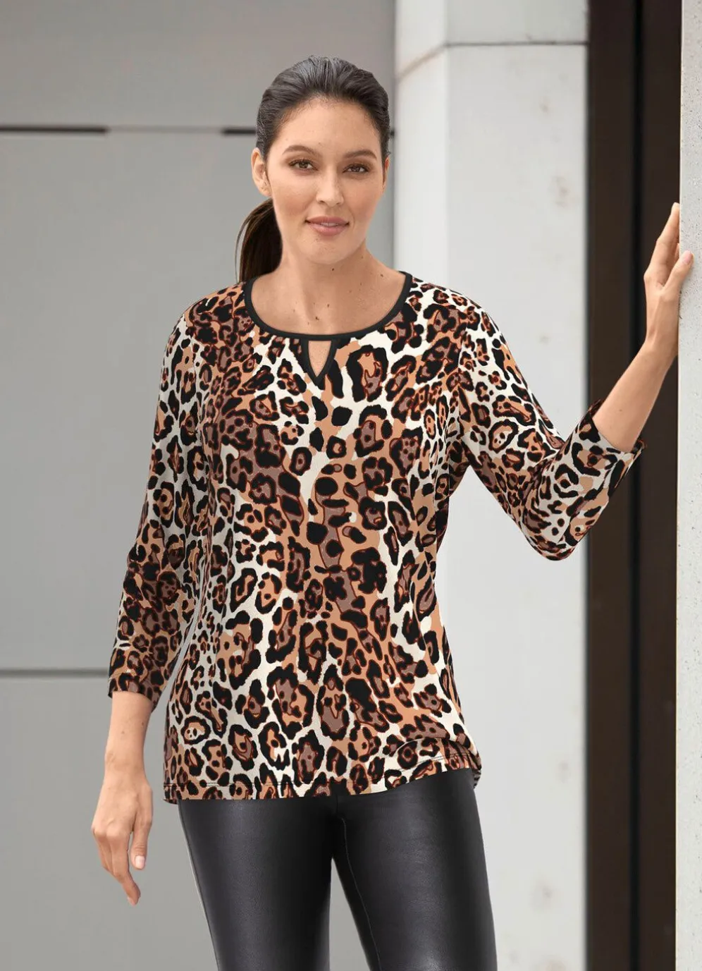 Jedes Teil ein Unikat! Fabelhaftes Shirt mit aktuellem Tierfell-Dessin allover in Beige-Schwarz-Ecru, Zierschlitz am Halsausschnitt sowie 3/4-langen Ärmeln.
