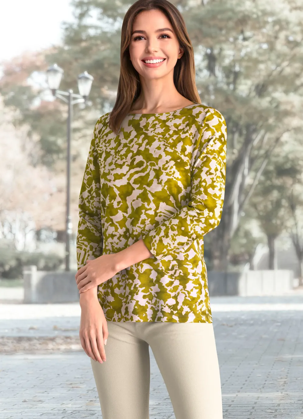 Jedes Teil ein Unikat! Shirt mit farbbrillantem Allover-Druck in Grün-Beige sowie 3/4 langen Ärmeln.
