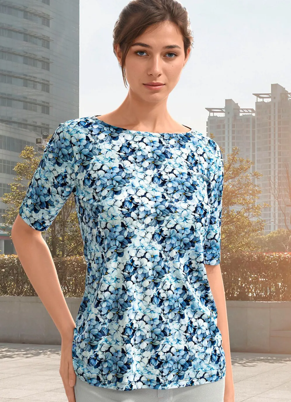Jedes Teil ein Unikat! Attraktives Shirt mit farbbrillantem Allover-Druck in Blau-Weiß sowie modisch flachem Halsausschnitt.