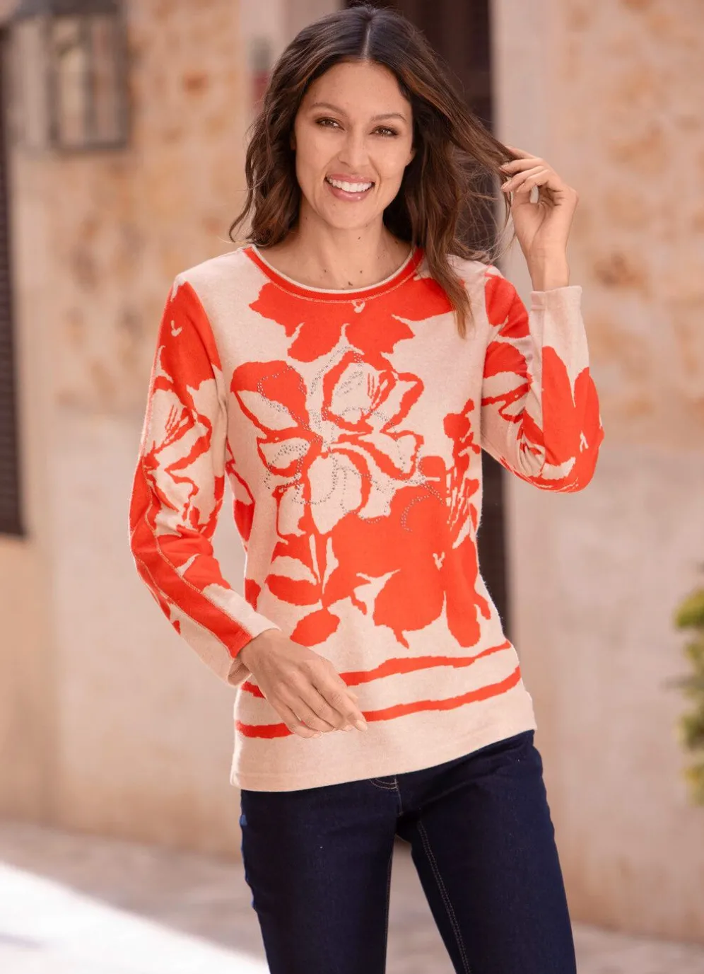 Faszinierendes Shirt in allover gemustert, Rundhals mit rolliertem Abschluss, schmückender silberfarbener Plättchenzier im Vorderteil sowie Flatlocknähten und Blockstreifen-Einsätzen an den Ärmeln.