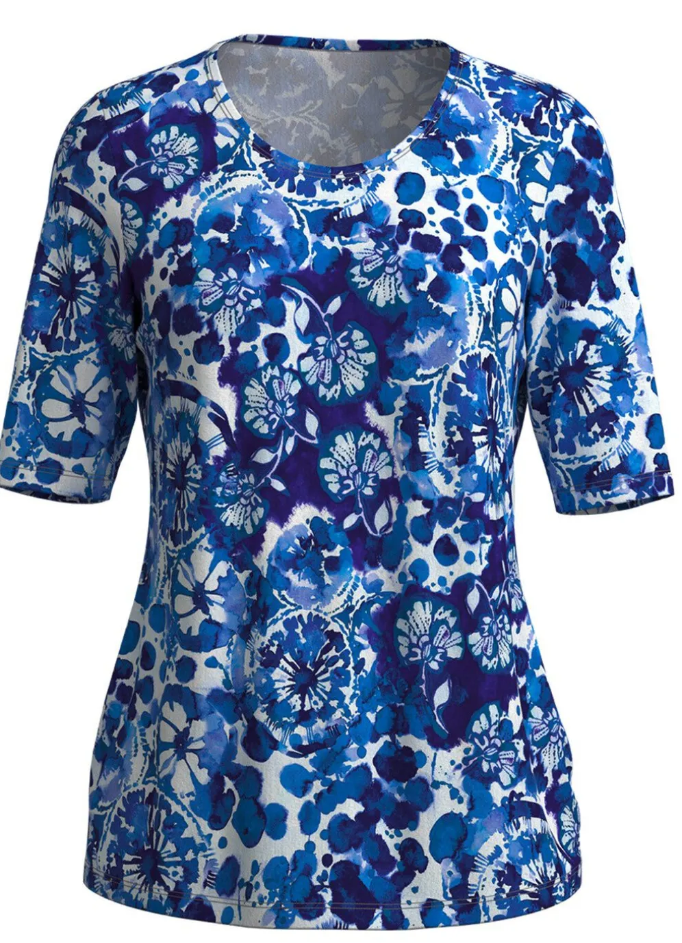 Jedes Teil ein Unikat! Shirt in Blau-Weiß, mit rundem Halsausschnitt, farbbrillantem Alloverdruck sowie kurzen Ärmeln.