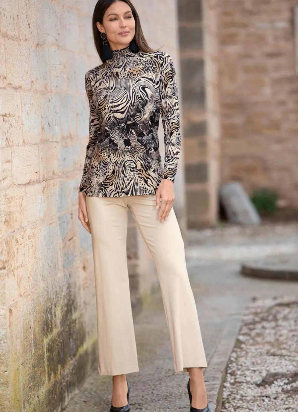 Jedes Teil ein Unikat! Ausdruckvolles Shirt mit farbbrillantem Allover-Druck in Schwarz-Ecru-Camel sowie gesmoktem Stehkragen.