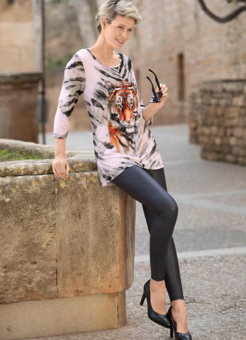 Jedes Teil ein Unikat! Shirt mit farbbrillantem Allover-Druck in Schwarz-Grau, platziertem Tiermotiv in Terrakotta und Strasszier im Vorderteil sowie 3/4-langen Ärmeln.