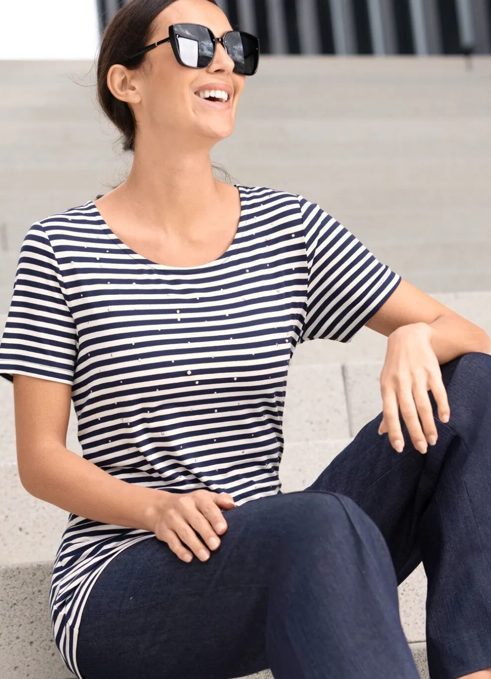 Shirt in Marine-Weiß von laurakent mit garngefärbtem Ringel-Dessin, sowie Perlen-, Plättchen- und Strasszier im Vorderteil.