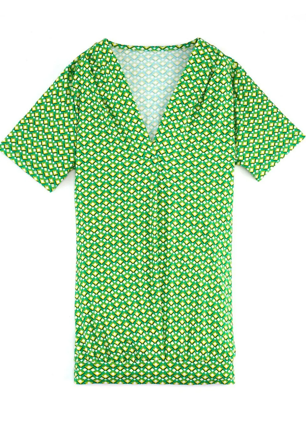Hinreißendes allover gemustertes Shirt mit Faltenlegung und Teilungsnaht im Vorderteil sowie rückwärtige Smokverarbeitung am Bundabschluss.