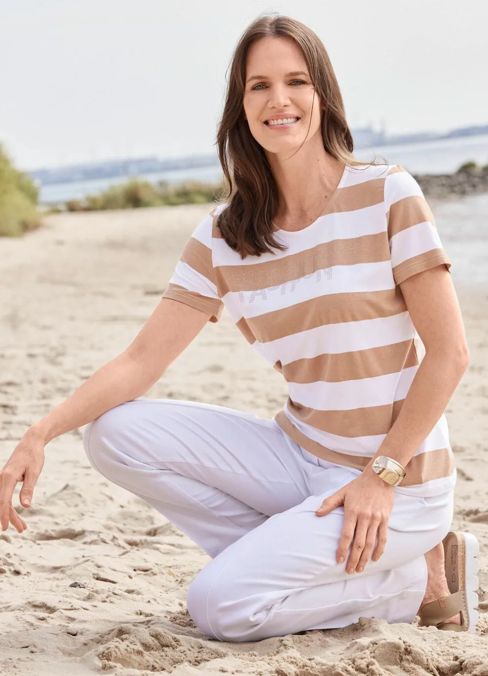 In Weiß-Sand: Shirt von laurakent mit farbbrillantem Allover-Streifendruck und Plättchenzier.