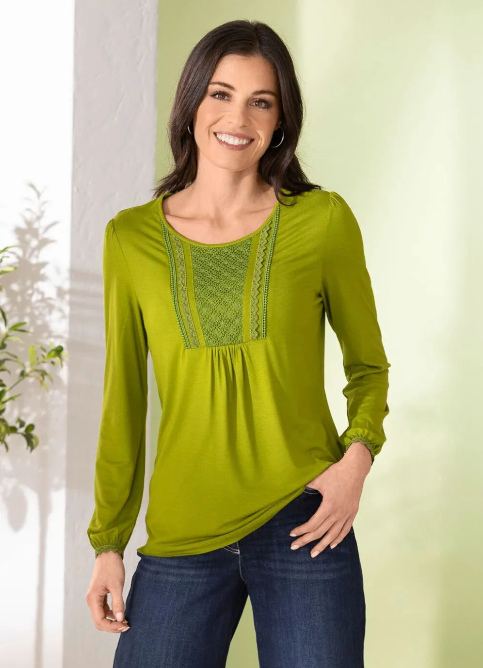 Tolles Shirt in Kiwigrün mit aufwendigen Spitzenbesätzen und Fältelung im Vorderteil, langen Ärmeln mit dezenter Kräuselung am Schulterbereich sowie Spitzenabschluss mit Schlaufenknopfverschluss.