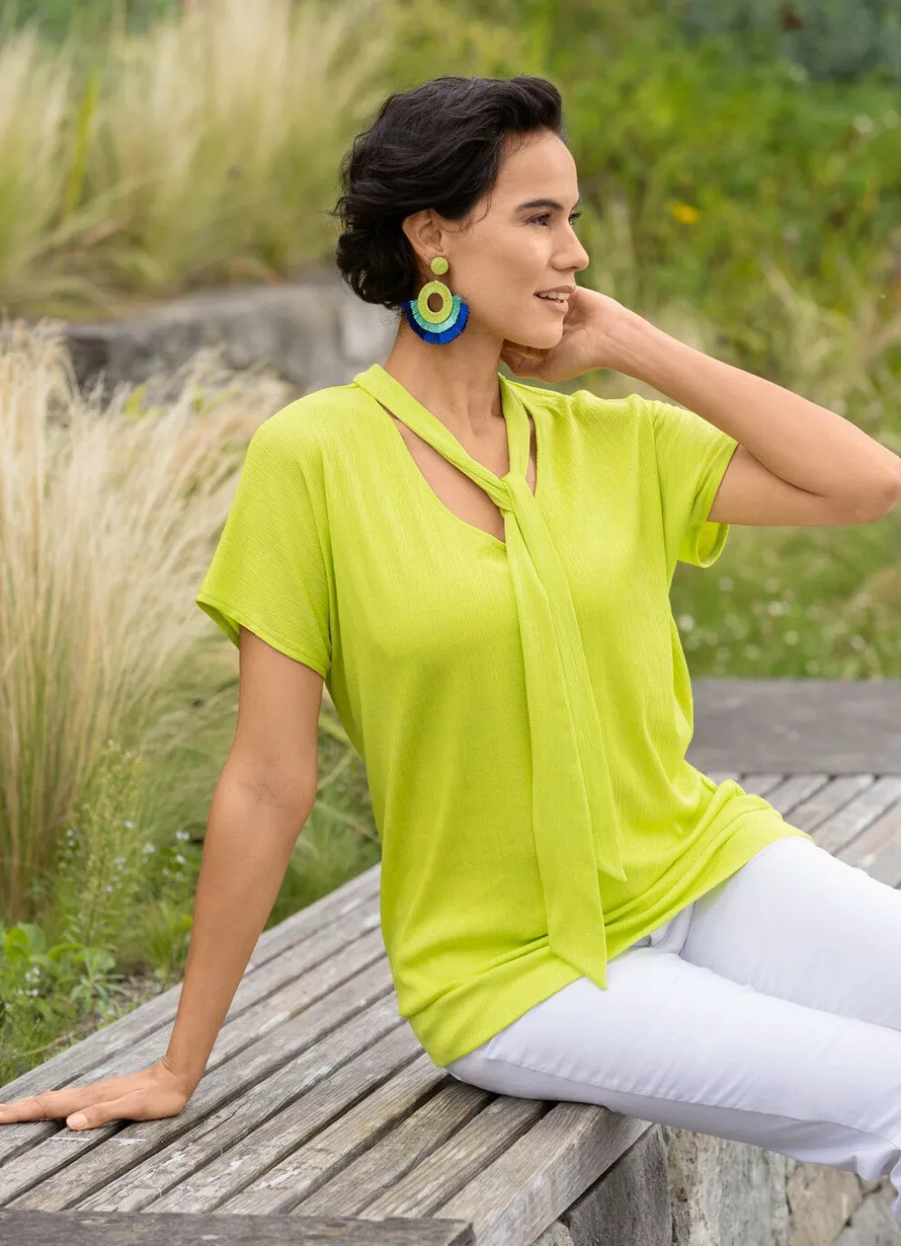 Elegantes Shirt von laurakent in Limone mit V-Ausschnitt und Schluppe, überschnittener Schulterpartie und angesetztem Bundabschluss.