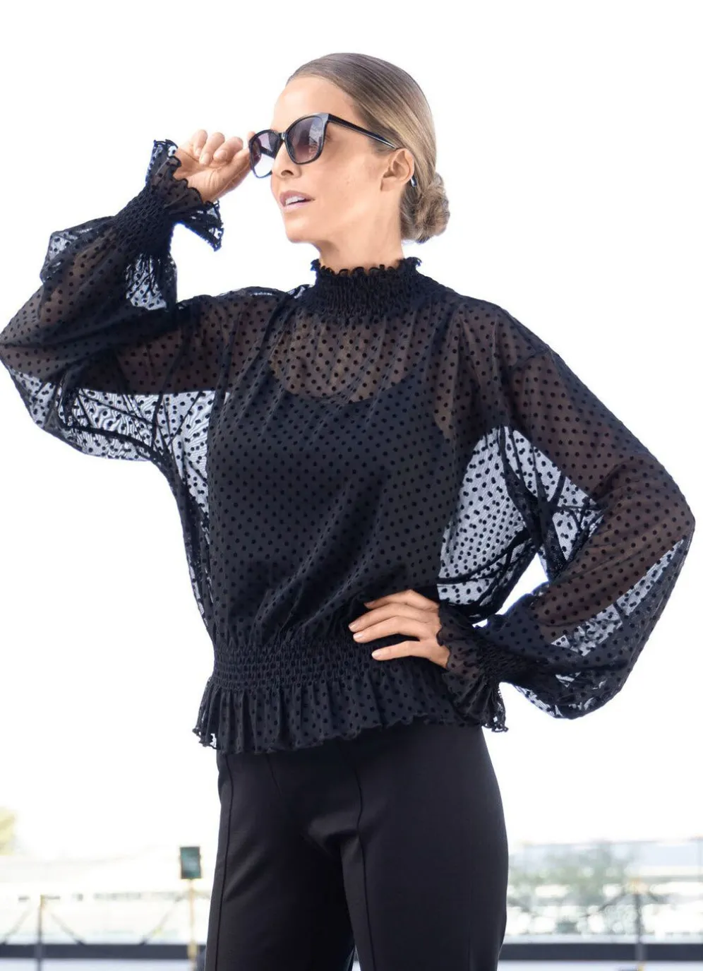 Denzent trasparentes Shirt von TIZIA mit Smokverarbeitung am Stehkragen, den langen Ärmeln und am Saum, sowie gekäntelte Abschlüsse.