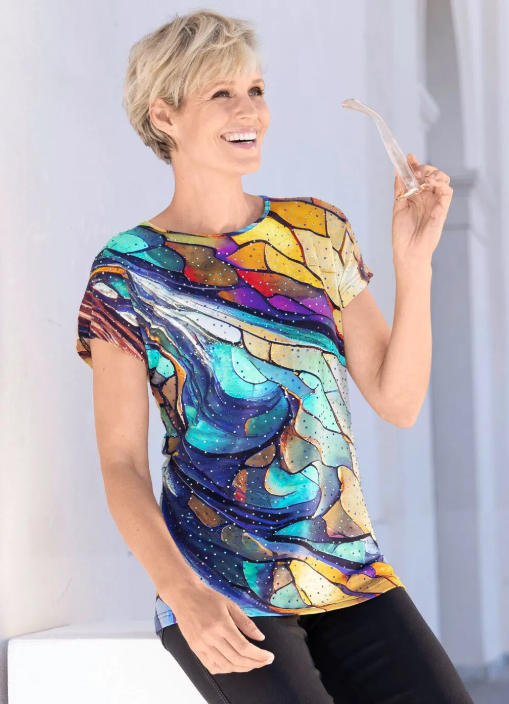 Jedes Teil ein Unikat! Faszinierendes Shirt mit farbbrillantem Allover-Druck in Multicolor, Strasszier im Vorderteil sowie überschnittener Schulterpartie.