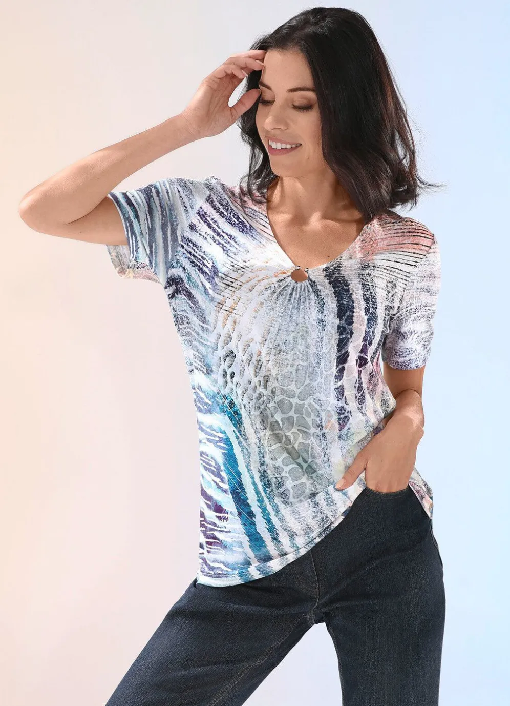 Jedes Teil ein Unikat! Fabelhaftes Shirt mit farbbrillantem Inkjet-Druck in Blau-Aqua-Beige-Apricot allover, V-Ausschnitt mit Zierring und Faltenlegung.