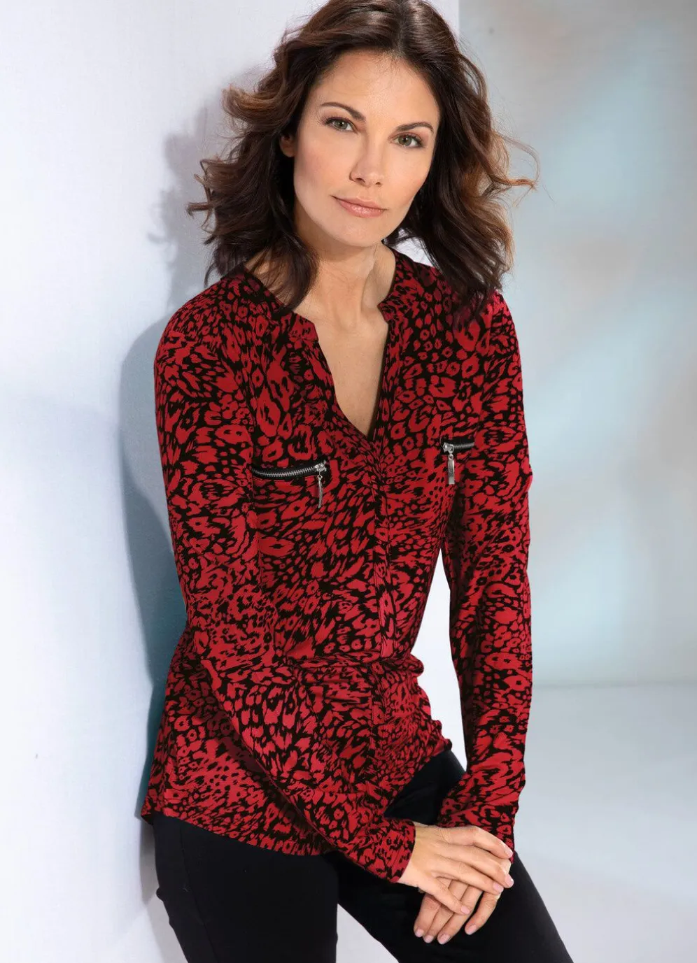 Das absolute Highlight ist dieses allover dessinierte Shirt mit V-Schlitz und Zierblende, angedeuteten Brusttaschen mit Reißverschluss im Vorderteil sowie abgerundetem Saumabschluss im Vorder- und Rückteil.