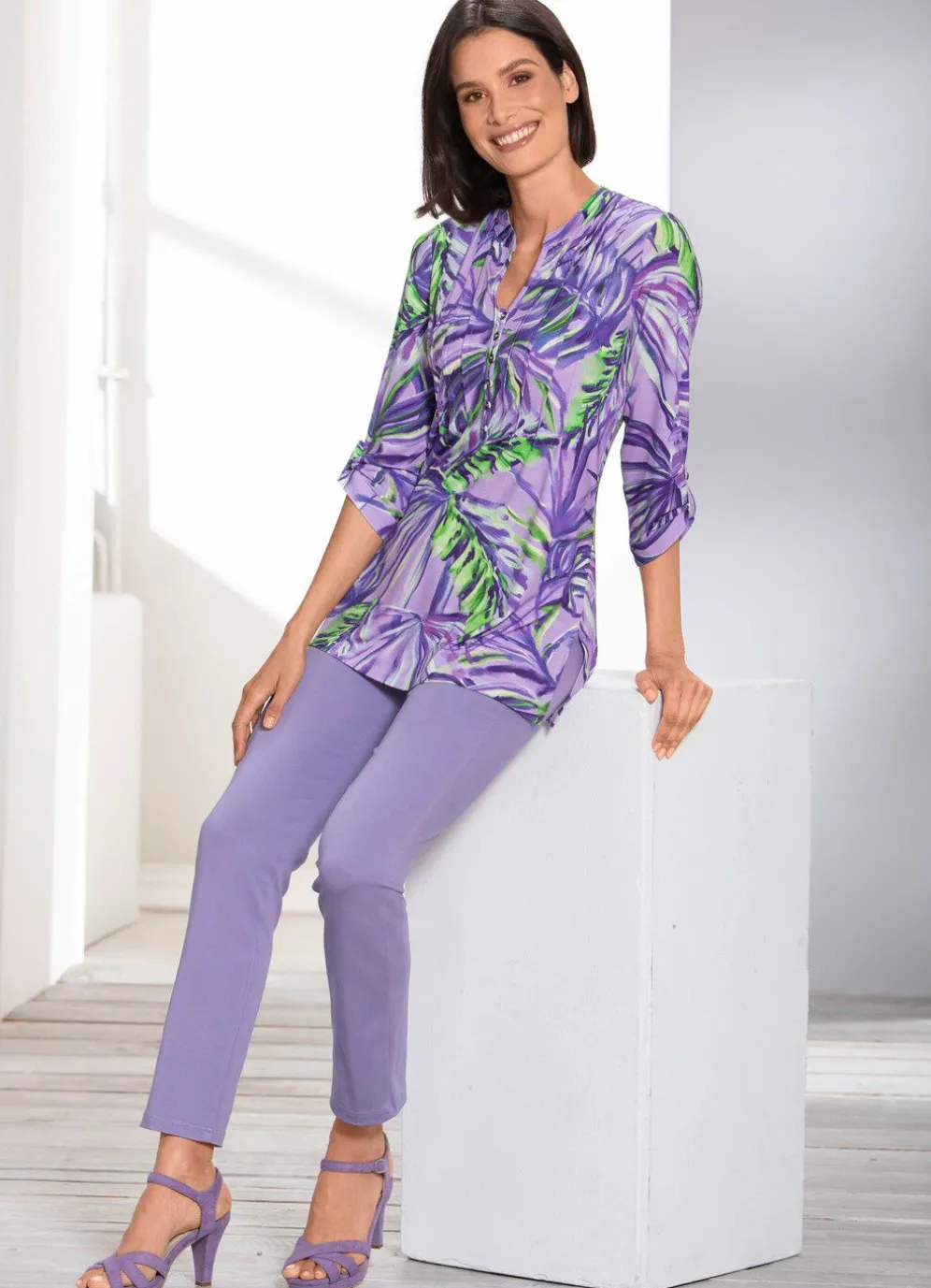 Mit farbbrillantem, lila-flieder-grün-buntem Druck präsentiert sich diese schöne Shirt-Tunika mit Stehkragen, Schlingenknopfverschluss mit kurzem Schlitz, 3/4-langen Ärmeln, hübscher Fältelung und Biesenzier im Vorderteil sowie Seitenschlitzen.