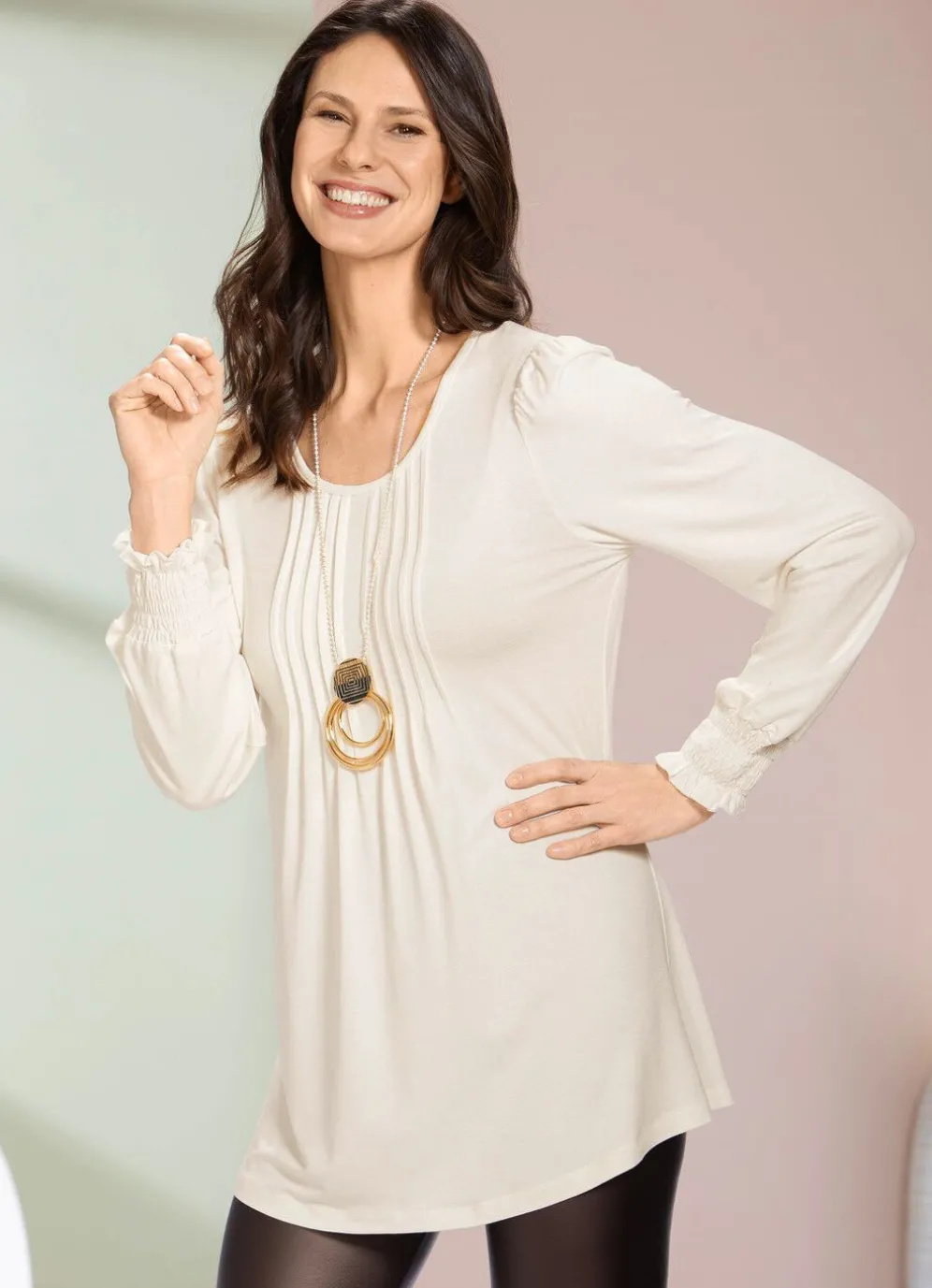 Flotte Shirt-Tunika mit rundem Halsausschnitt, Biesenzier mit aufspringenden Fältchen im Vorderteil, elastisch gesmokten Abschlüssen an den langen Ärmeln sowie Rückenpasse.