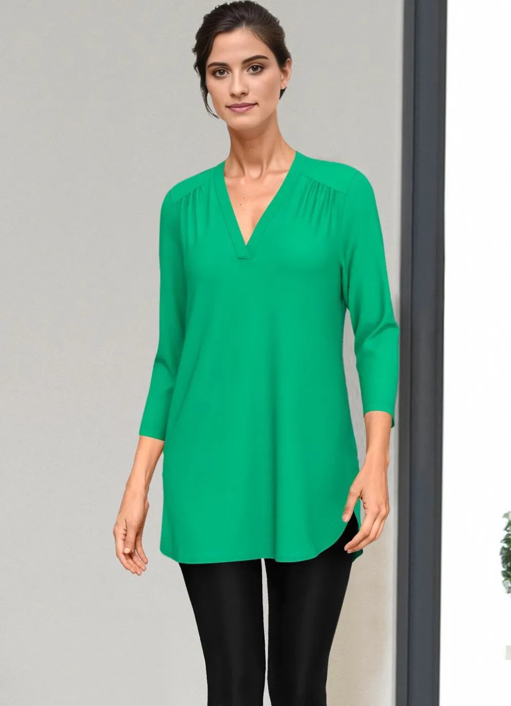Schöne Shirt-Tunika mit V-Ausschnitt, gekräuselte Vorderpasse, 3/4-langen Ärmeln sowie seitlich abgerundetem Saum.
