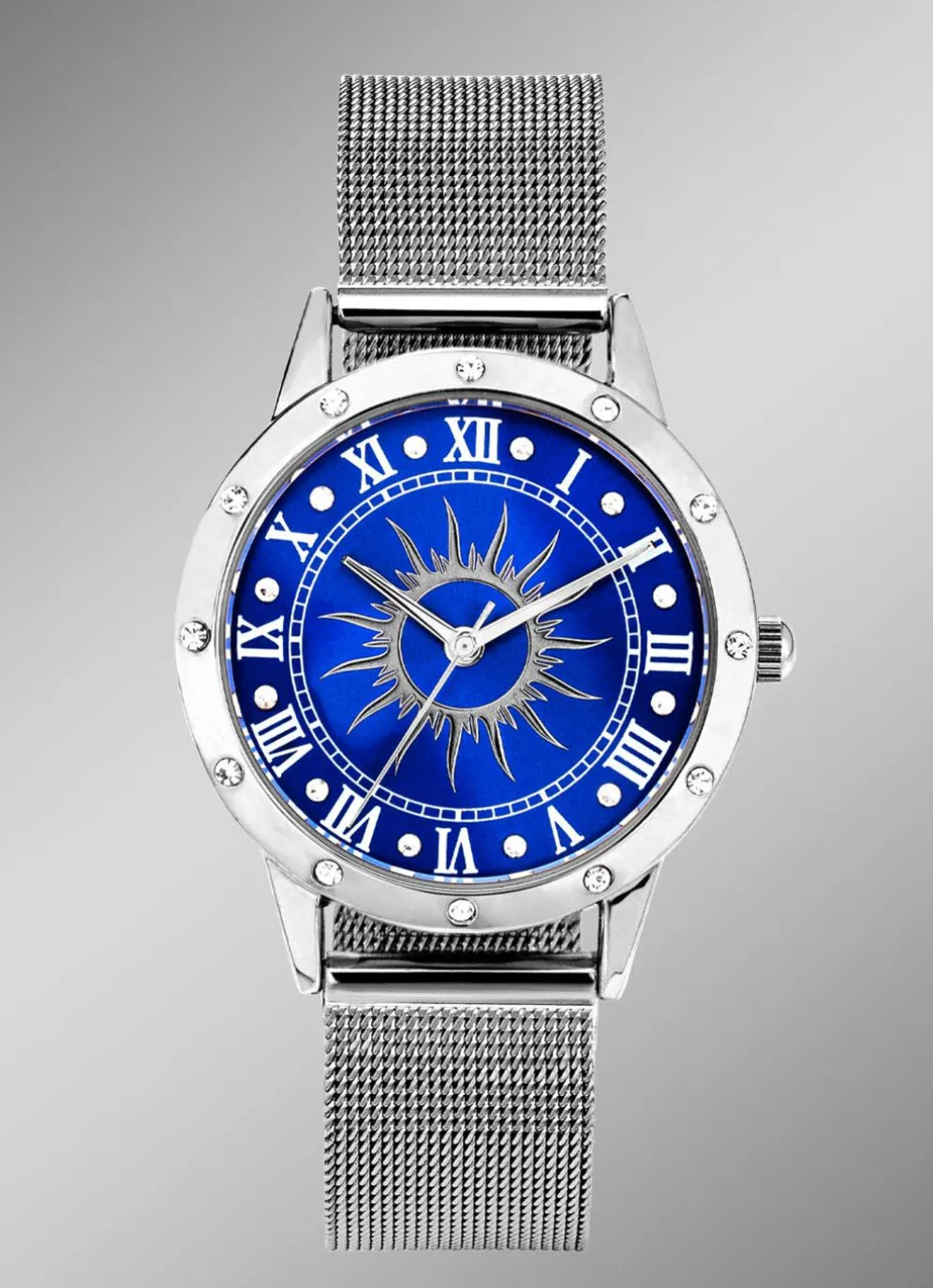 Silberfarbene Damenuhr mit Sonnenmotiv und Kristallakzenten