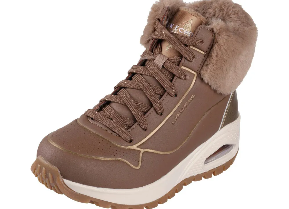 Boots aus Synthetik mit flauschigem Plüschkragen: Schnürung, seitlicher Reißverschluss, Textilfutter, gepolsterte Decksohle, Gummi-Profilsohle mit sichtbarem Luftpolster sowie 20 mm Keilabsatz. Schafthöhe ca. 10 cm