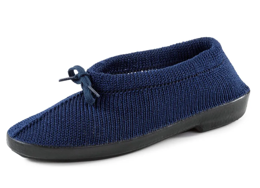 Luftiger Slipper aus elastischem Strickmaterial mit Schnürung: herausnehmbares Fußbett mit Baumwollfrottee-Bezug, leichte PU-Profilsohle, 10 mm Keilabsatz