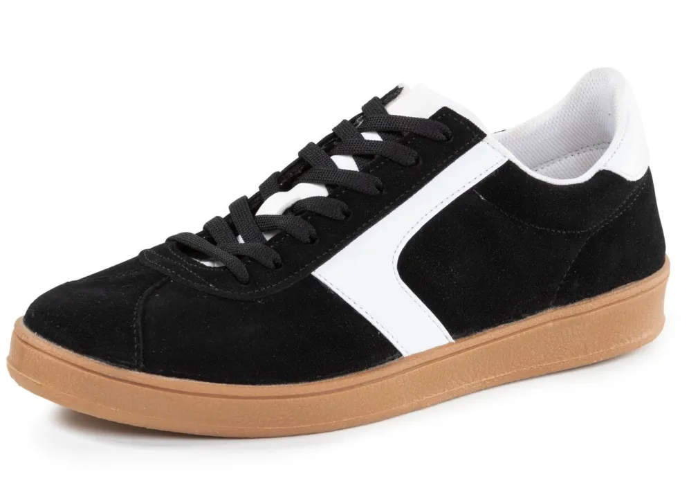 Angesagter Sneaker aus Veloursleder mit weißen Nappa-Besätzen und gepolstertem Schaftrand: Schnürung, Futter, herausnehmbares Fußbett sowie leichte PVC-Riffelsohle