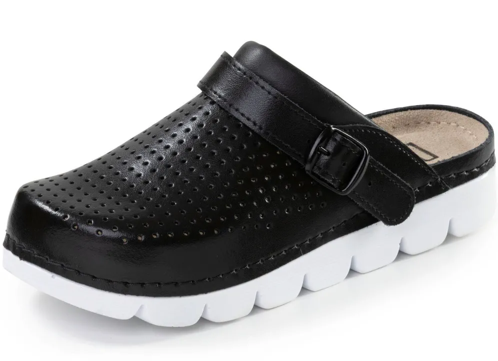 Luftig perforierte Clogs aus Nappaleder, mit Zier-Spange, die heruntergeklappt als Fersenriemen getragen werden kann. Gepolstertes Lederfußbett sowie leichte PU-Profilsohle mit flachem Keil
