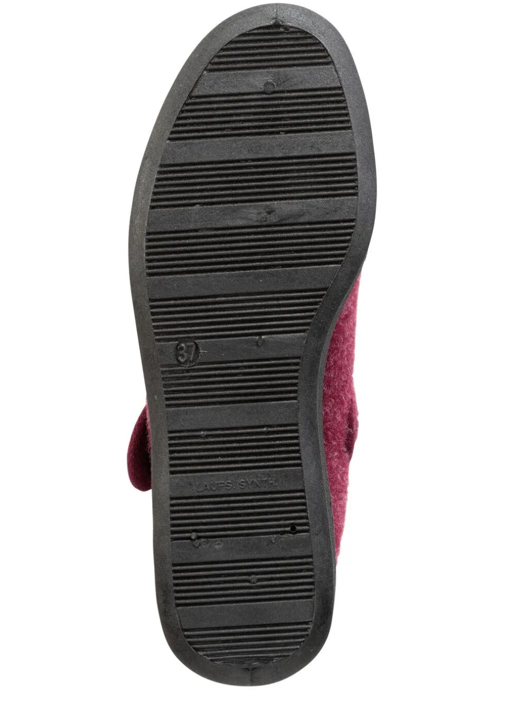 Spangenschuh aus weichem Filz, mit Klettverschluss: molliges Futter und Decksohlenbezug aus reiner Schurwolle, leichte PVC-Riffelsohle sowie 15 mm Keilabsatz