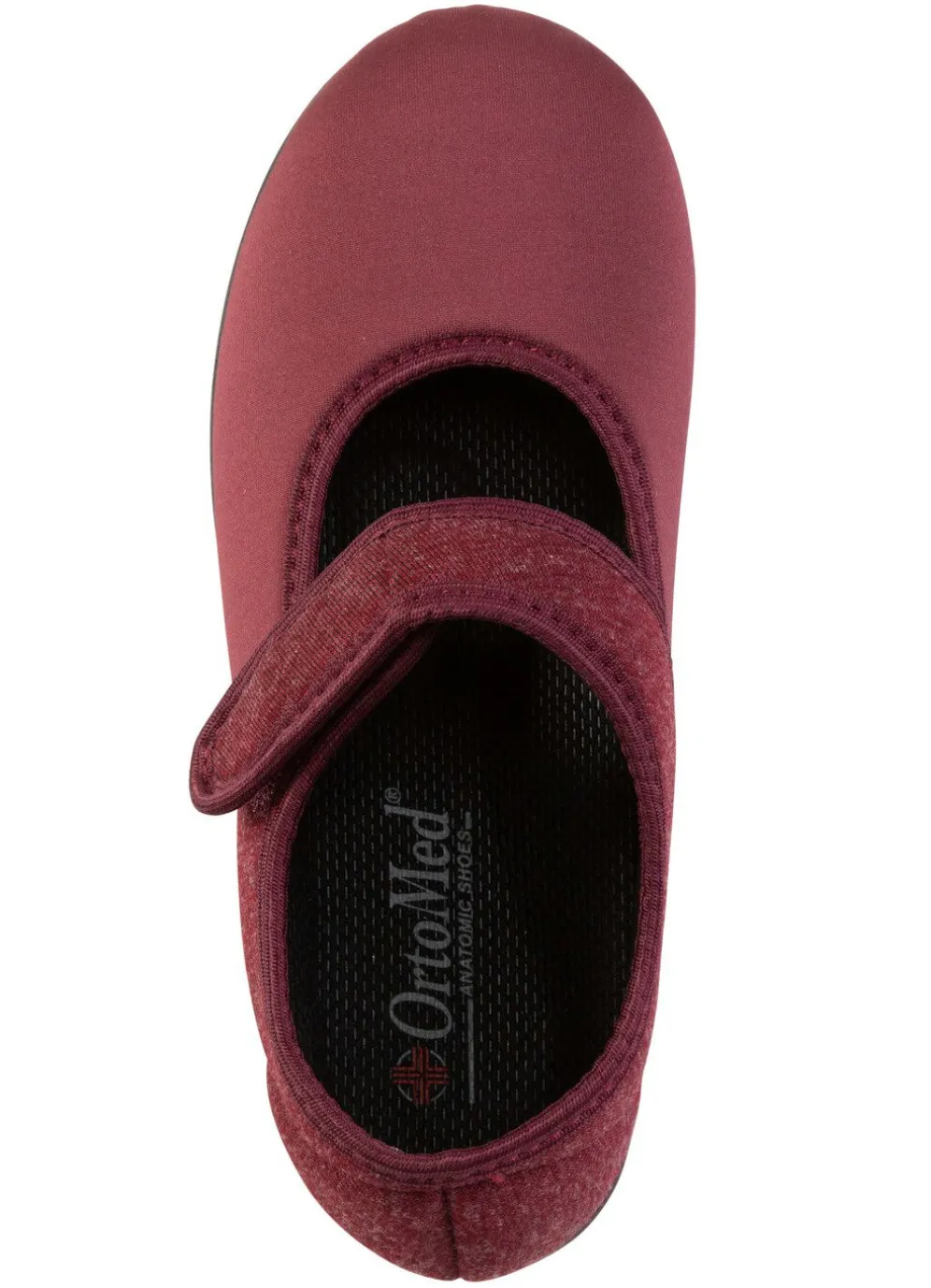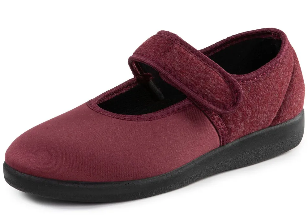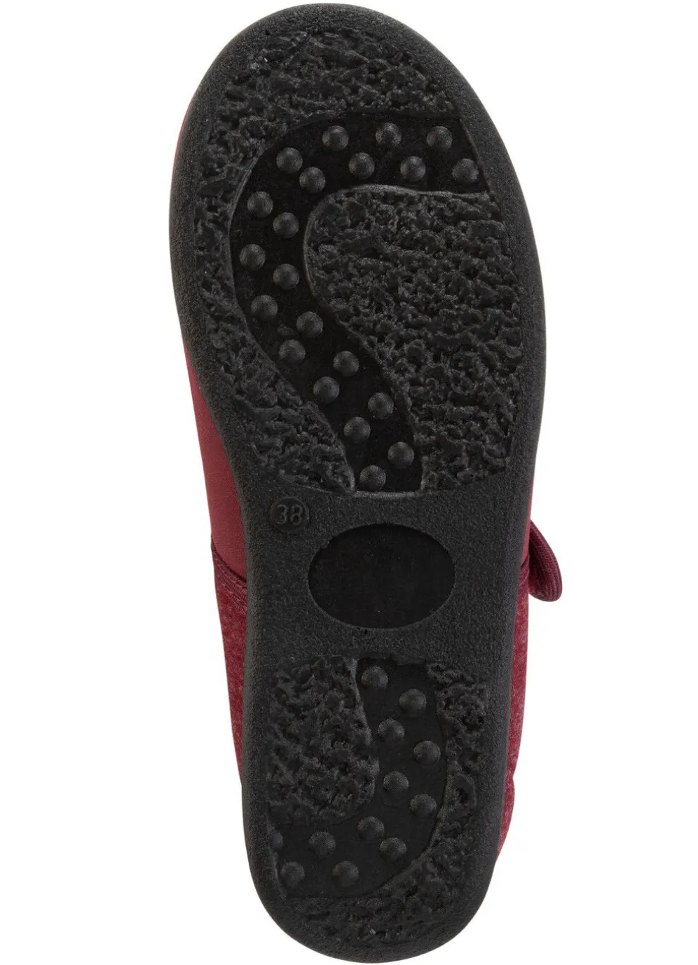 Spangenschuh aus weichem Textilmaterial, teilweise meliert: Weite H, Klettverschluss, gepolstertes Textilfutter, herausnehmbares Fußbett, superleichte PU-Laufsohle sowie 15 mm Keilabsatz