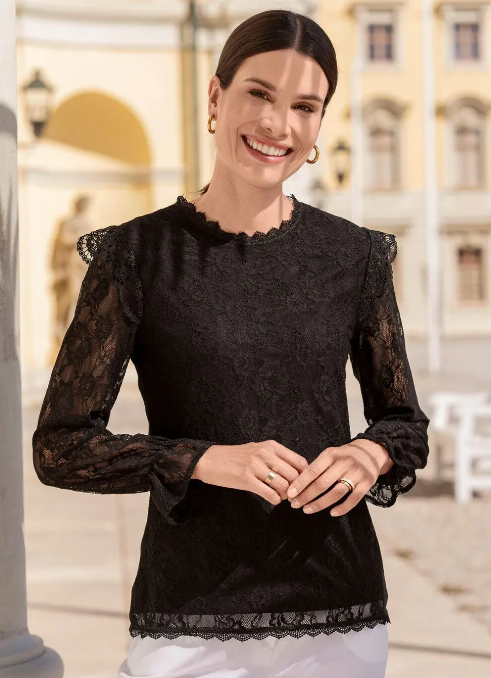 Faszinierendes Spitzenshirt von laurakent mit unterlegtem Vorder- und Rückteil, Schlaufen-Knopf-Verschluss im Rückteil, sowie Gummizug an den langen Ärmeln.