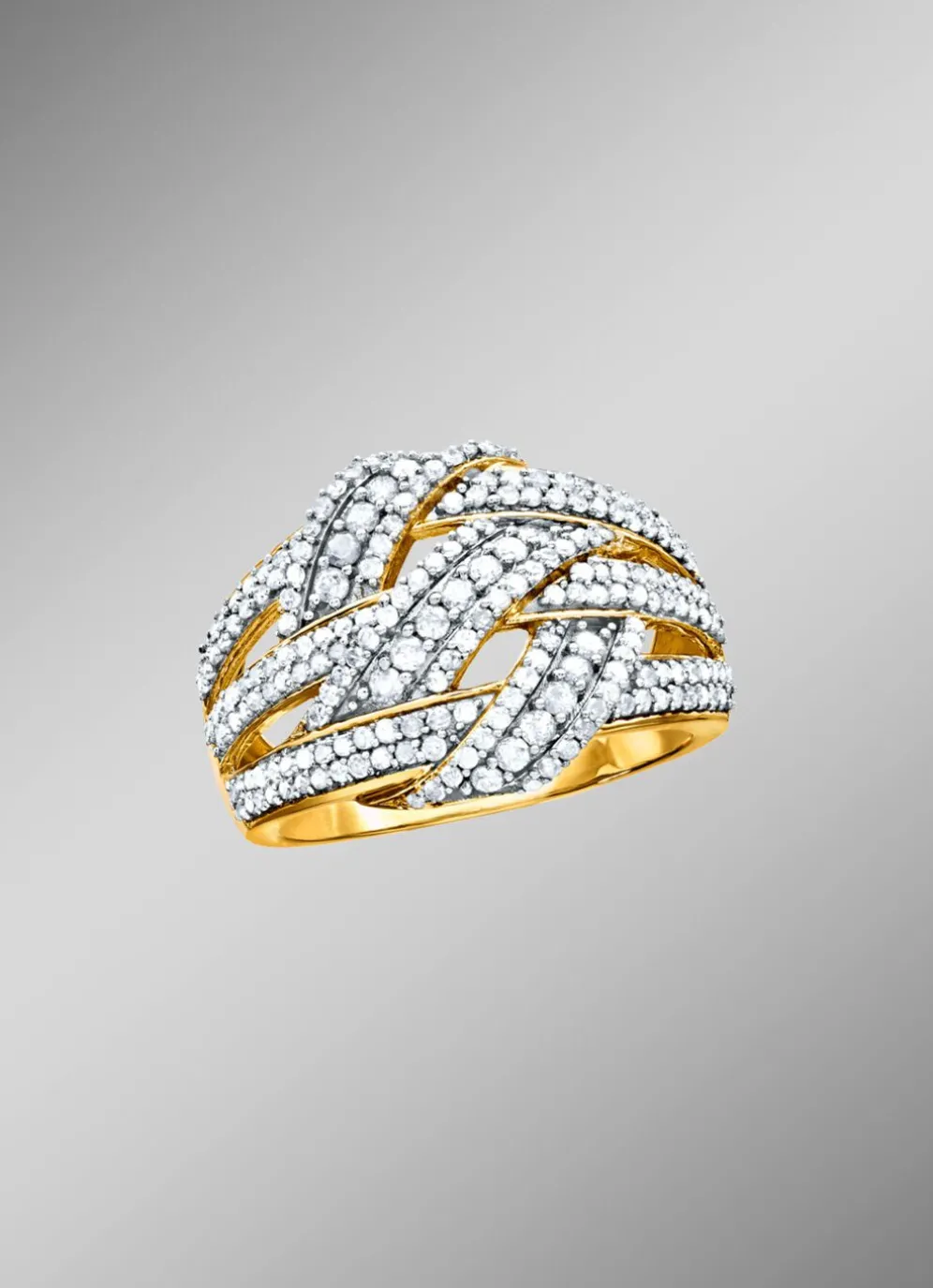 Verschlungene Leidenschaft in Gold 585/- fein. Wie das Band Ihrer Beziehung ist auch dieser Damenring mit 19 Brillanten, zusammen 0,25 ct., Weiß, Piqué 2 und 194 Diamanten, zusammen 0,75 ct., Weiß, Piqué 2, gezeichnet durch viele Facetten und doch unendlich miteinander verbunden.