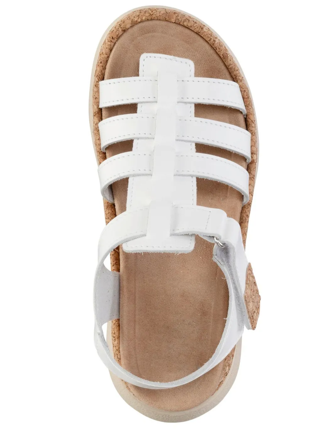 Stegspangen-Sandale aus Veloursleder, in Weiß aus Nappaleder, mit Kork-Besätzen und verstellbarer Klettspange: herausnehmbares Fußbett, leichte PU-Profilsohle mit 30 mm Plateau und 50 mm Keil