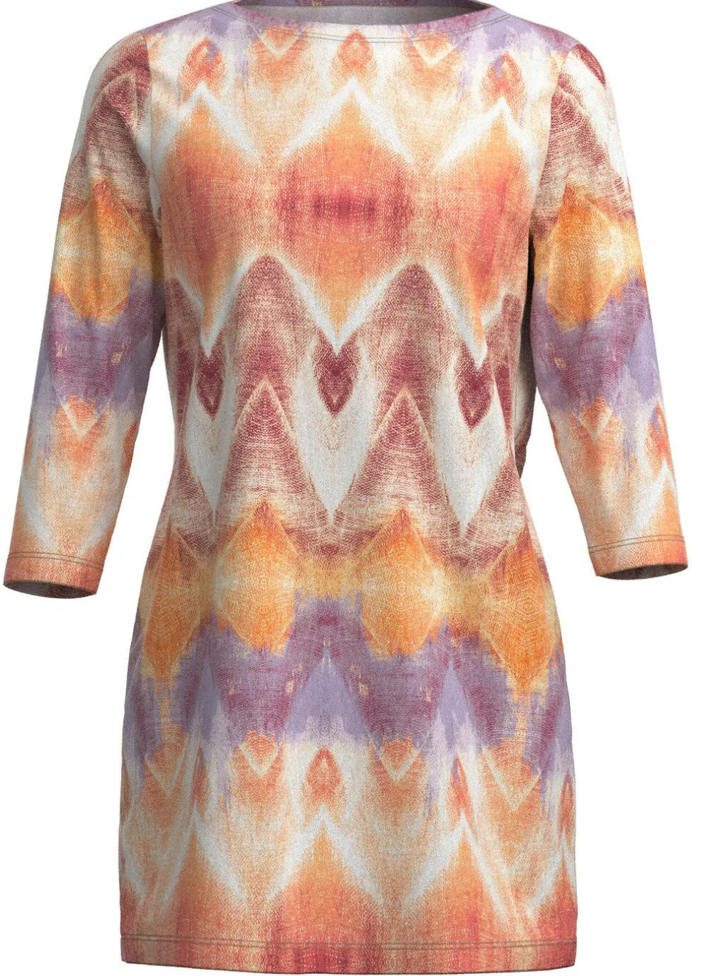 Jedes Teil ein Unikat! Strick-Tunika mit modisch flachem Halsausschnitt, farbbrillantem Alloverdruck in Ecru-Orange-Multicolor sowie 3/4-langen Ärmeln.