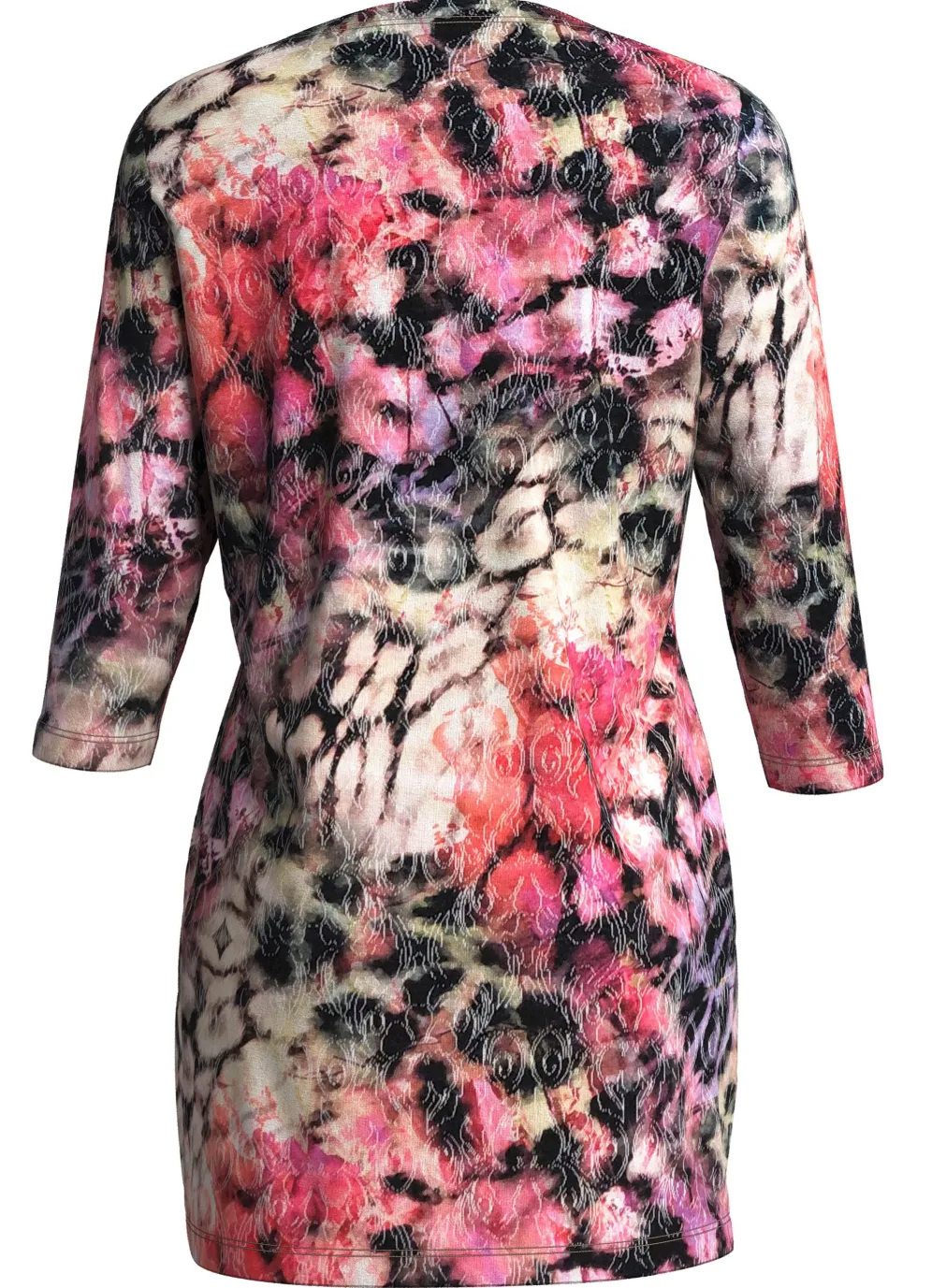 Jedes Teil ein Unikat! Strick-Tunika mit modisch flachem Halsausschnitt, farbbrillantem Druck in Creme-Pink-Multicolor, Mustermix allover, dezenten Glitzerakzenten, 3/4-langen Ärmeln.