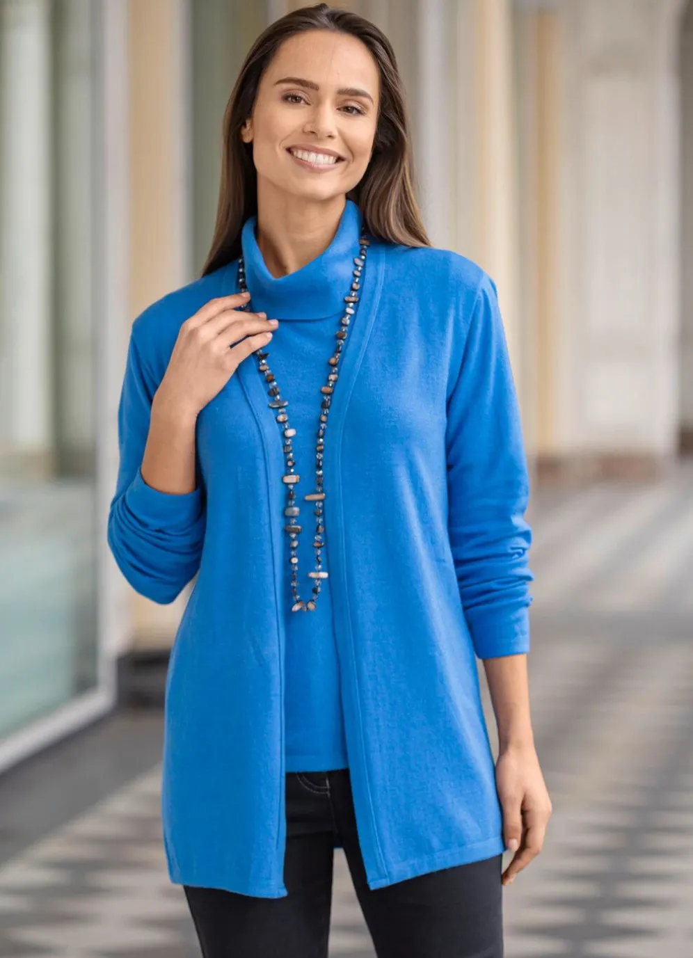 Strickjacke in verschlussloser Form, mit V-Ausschnitt sowie langen Ärmeln.