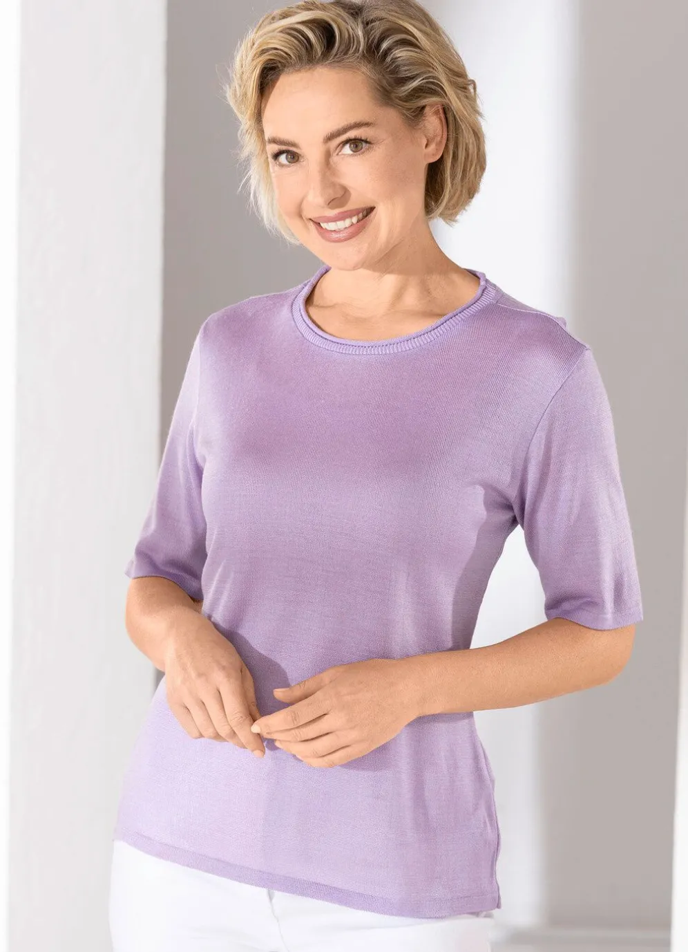 Dazu gehört der leicht taillierte Pulli aus Feinstrick, mit rolliertem Halsausschnitt sowie kurzen Ärmeln.