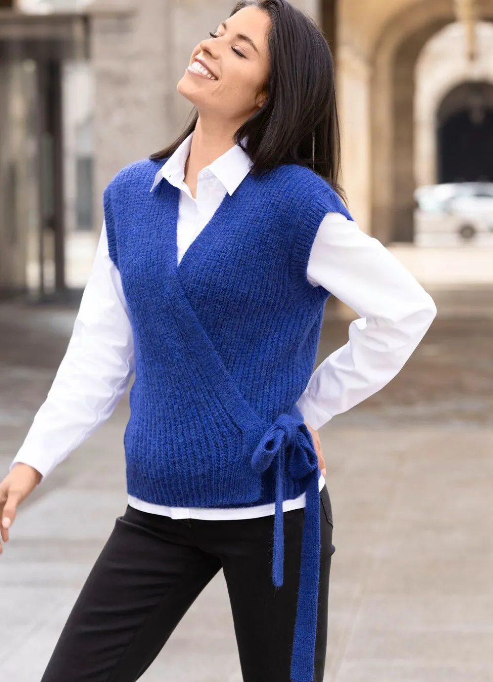 Diese raffinierte, royalblaue Strick-Wickelweste in Perlfangstrick allover verleiht jedem Outfit eine schmeichelhafte Silhouette und lässige Eleganz: V-Ausschnitt, überschnittene Form sowie Bindeband, das durch das integrierte Loch durchgeführt und zur Seite gebunden werden kann.