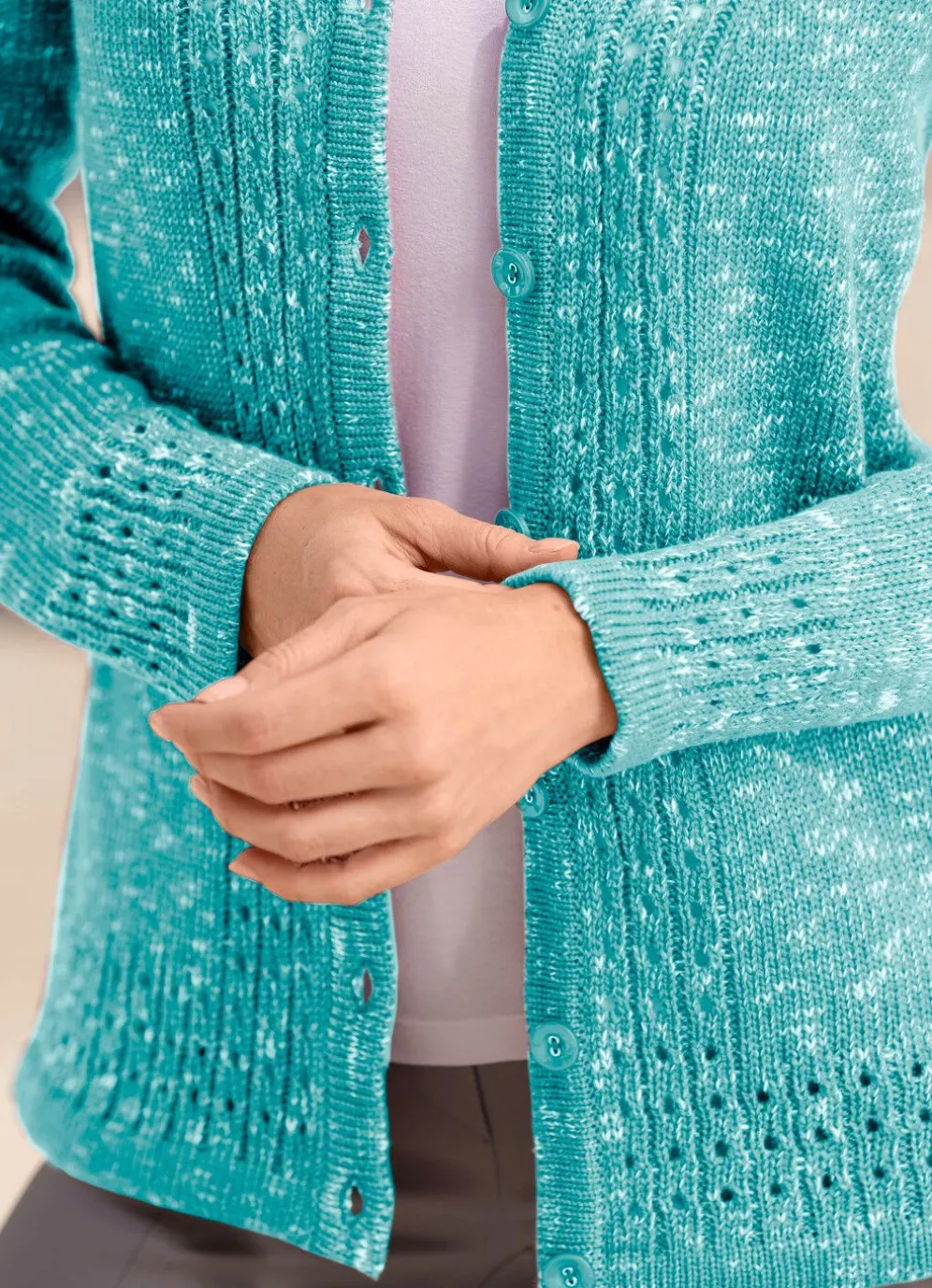 Ein unverzichtbares Kombitalent ist diese durchgeknöpfte Strickjacke aus Melangegarn mit Flammeffekt: V-Ausschnitt, Ajourmuster entlang der Blende, an den Abschlüssen der langen Ärmel und am Saum rundum.