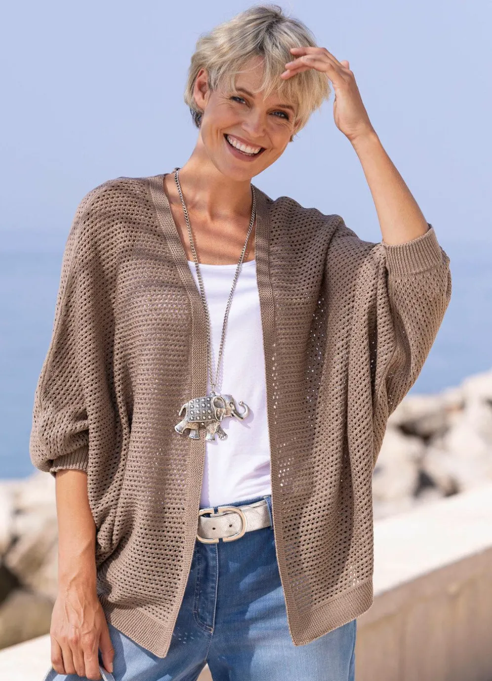 Ein pfiffiger Kombipartner ist diese verschlusslose, taupefarbene Strickjacke in lässig überschnittener Oversized-Form: 3/4-lange Fledermausärmel, Blende mit Biesendessin sowie hübsches Ajourmuster allover.