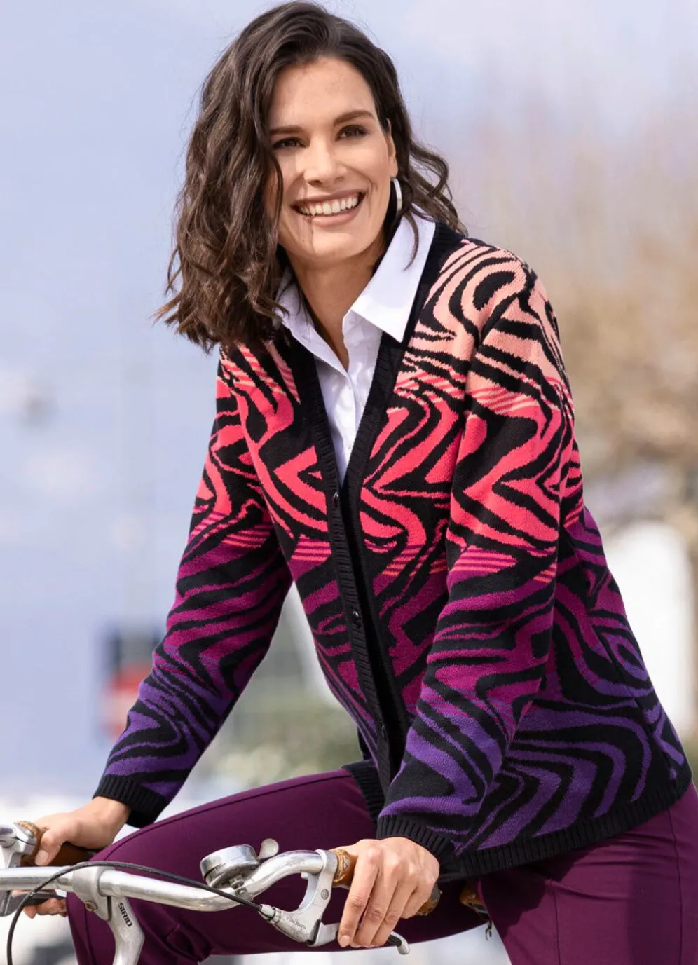 Hier überzeugt die Farbvielfalt. Durchgeknöpfte, schwarz-lila-multicolorfarbene Strickjacke im Wellendessin, mit apartem Farbablauf allover: streckender V-Ausschnitt sowie lange Ärmel mit gerippten Abschlüssen.