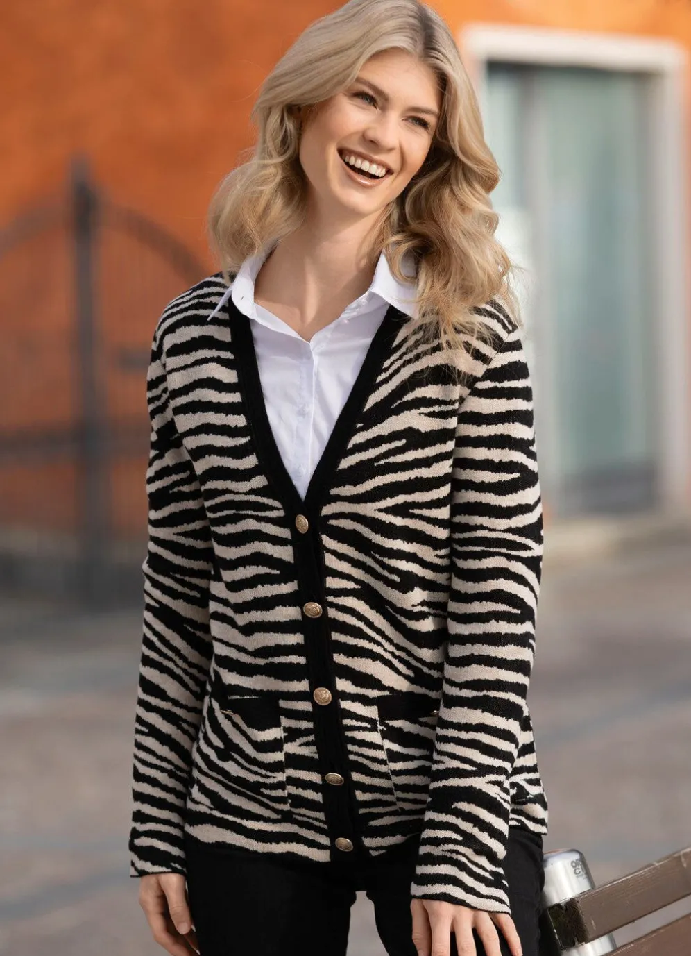 Ein faszinierendes Lieblingsstück ist diese durchgeknöpfte Strickjacke mit schwarz-beige meliertem Raubtierfell-Dessin allover, schönen, goldfarbenen Metallschmuckknöpfen, V-Ausschnitt, aufgesetzten Taschen mit Knopfverschluss sowie langen Ärmeln.