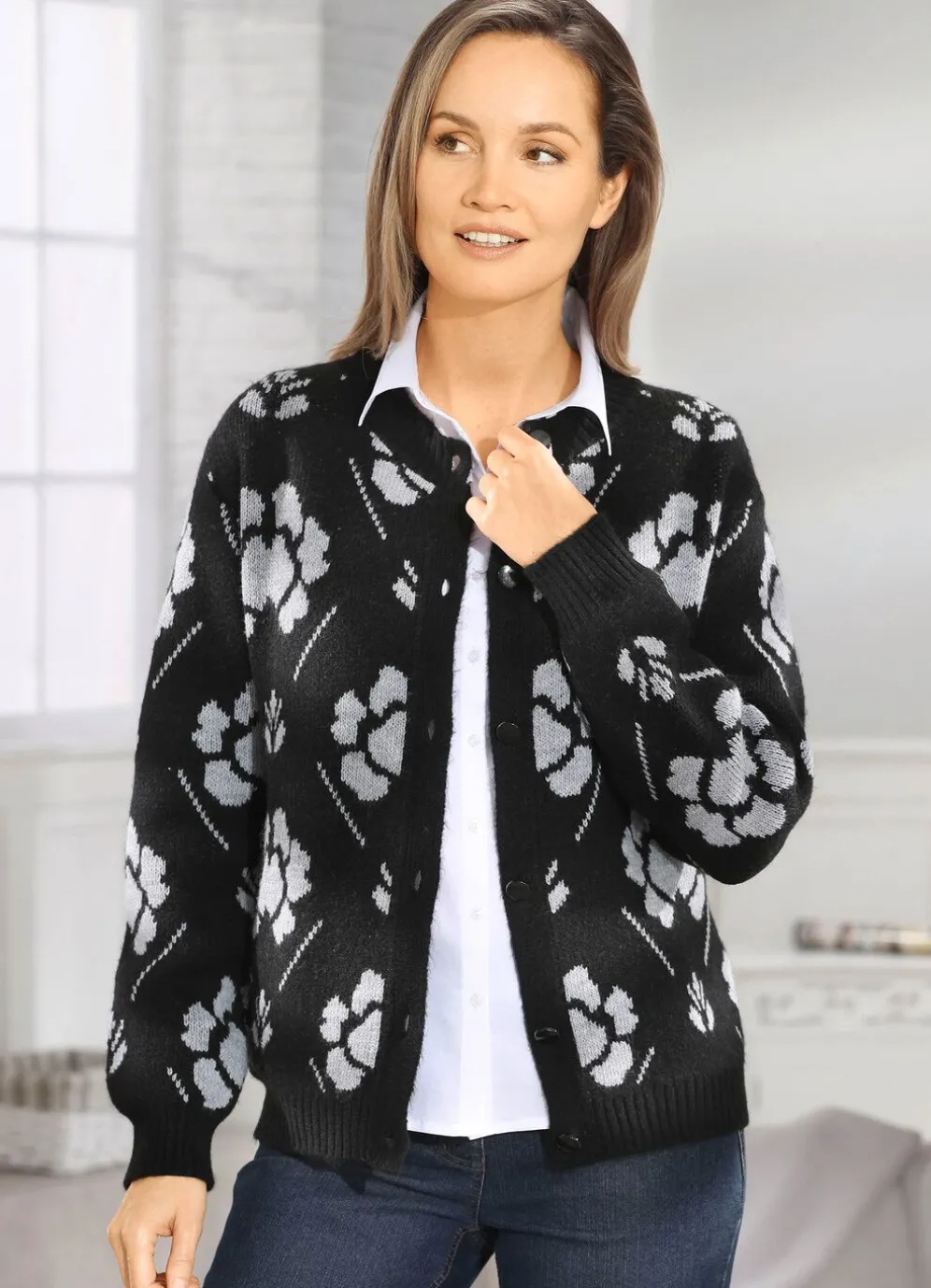 Durchgeknöpfte Strickjacke in Schwarz-Hellgrau meliert, mit Jacquard-Mustermix allover, rundem Halsausschnitt, langen Ärmeln sowie gerippten Abschlüssen.
