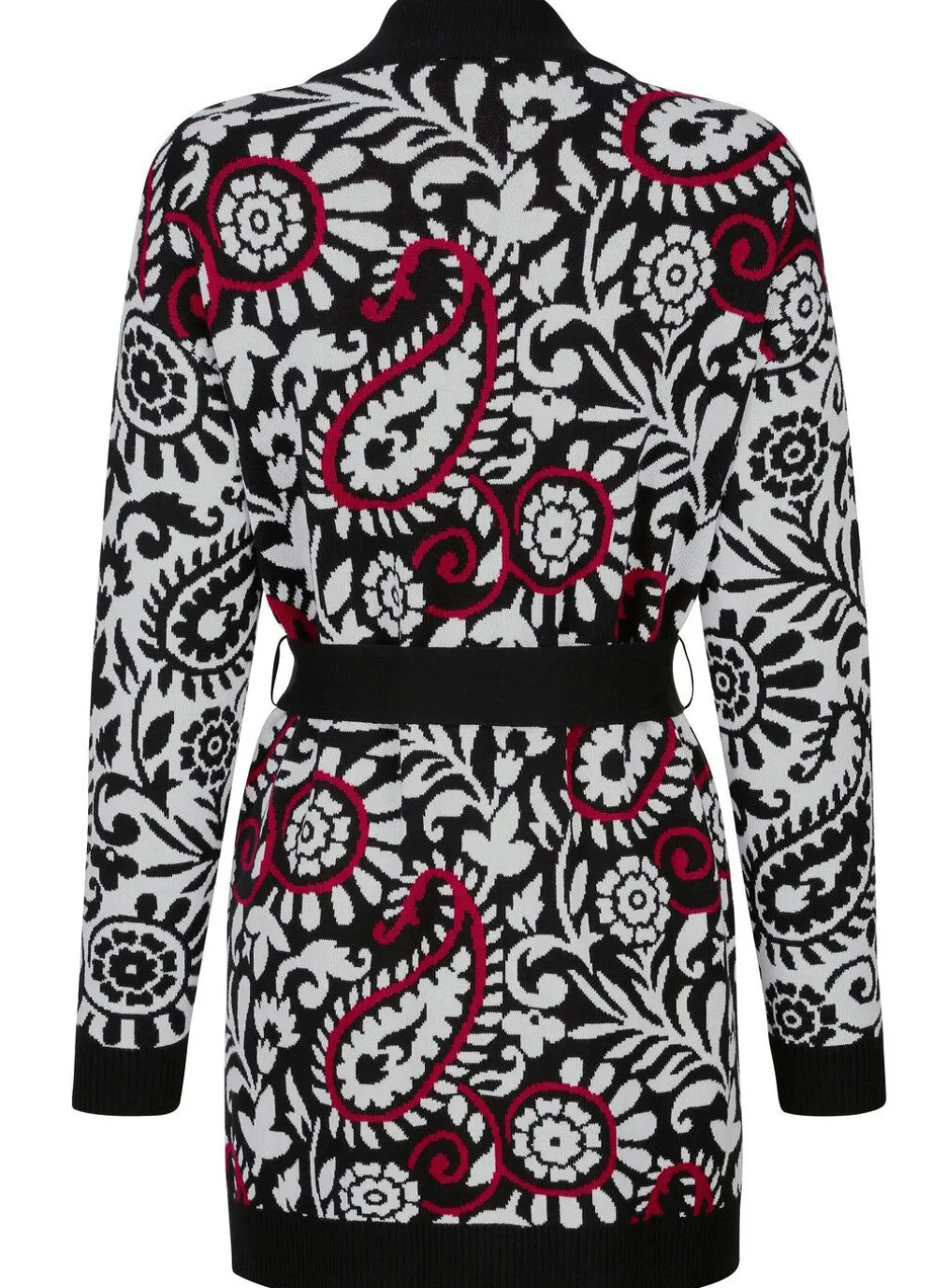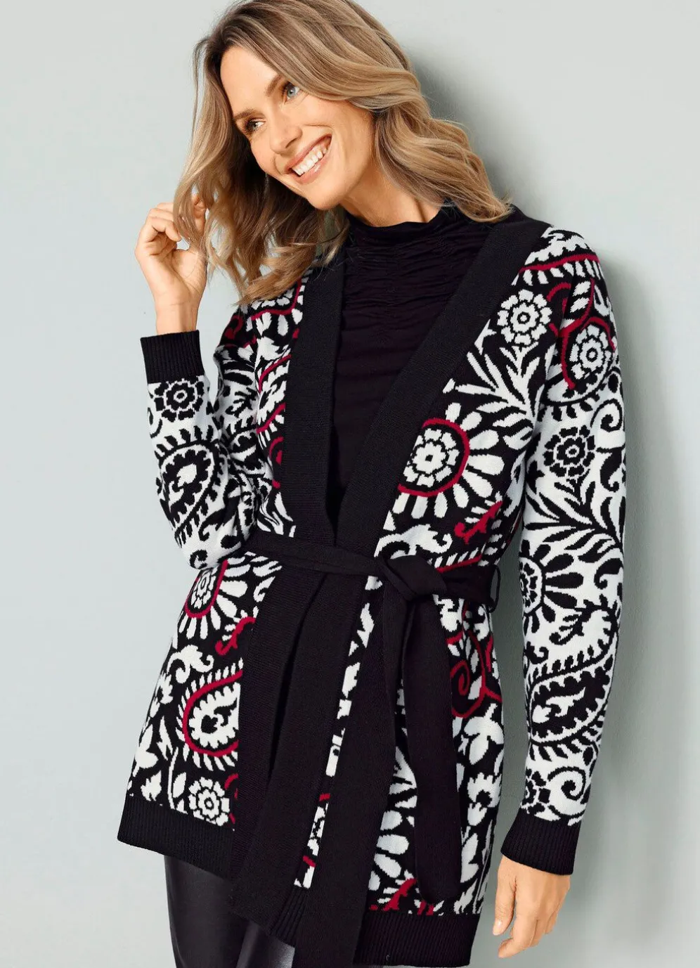 Hervorragende Strickjacke mit hochwertigem Jacquardmuster, V-Ausschnitt, Rippenbündchen an den Abschlüssen der langen Ärmel sowie Bindegürtel.