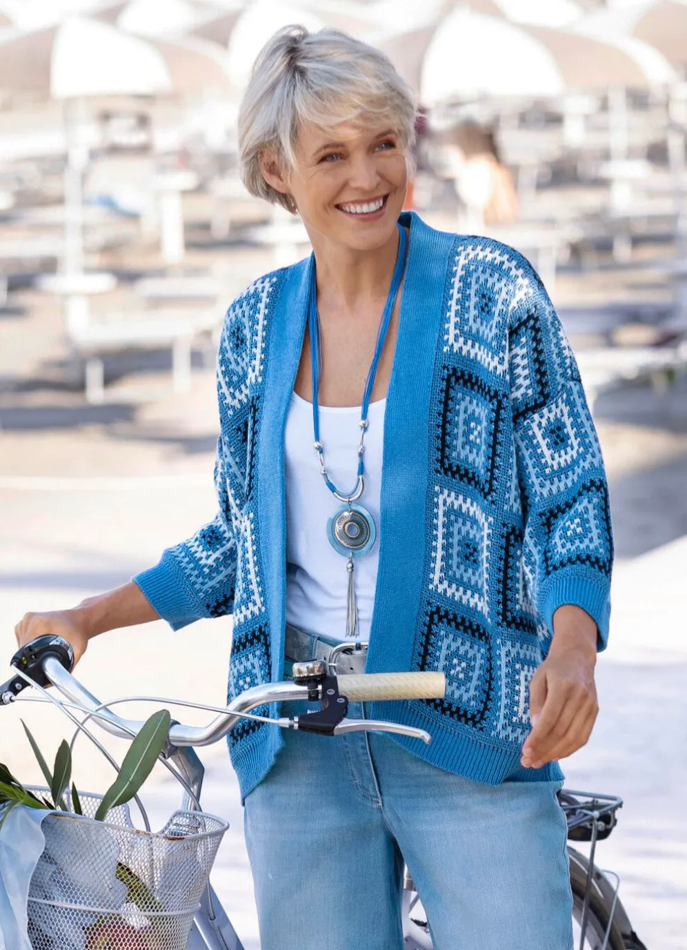 Verschlusslose Strickjacke in Jeansblau-Weiß-Multicolor, in Häkeloptik, mit grafischem Jacquardmuster allover, Blendenkragen, überschnittener Schulterpartie, Ärmeln in modischer Länge und gerippten Abschlüssen.