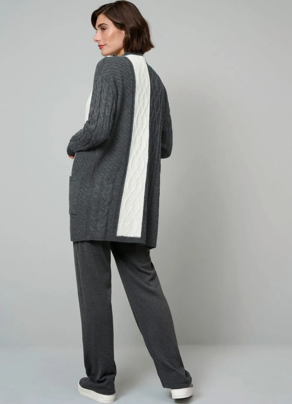 Strickjacke: verschlusslos, Color-Blocking im Rückteil seitlich versetzt, gepatchter Strukturmix, lange Ärmel, Melange-Effekte, 2 aufgesetzte Taschen.