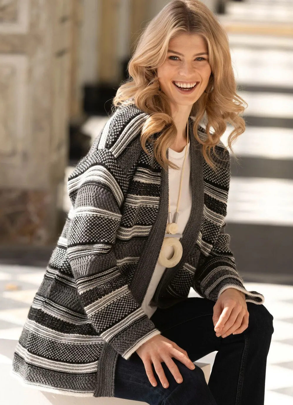 Ein Kuschelfavorit ist diese verschlusslose, schwarz-grau-ecrufarbene Strickjacke in leichter Oversized-Form, mit V-Ausschnitt, überschnittener Schulterpartie, hübschem Strukturmustermix in Streifenoptik mit Ajourakzenten und Glitzereffekten allover sowie langen Ärmeln.