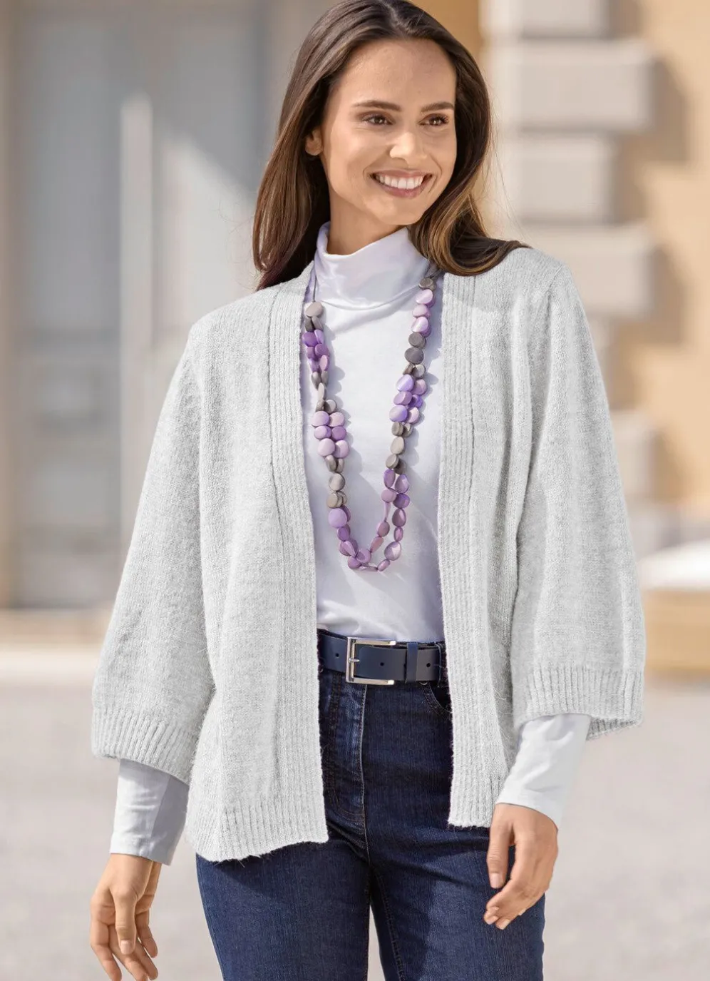 Das ideale Kombitalent ist diese verschlusslose Strickjacke mit etwas weiteren, 3/4-langen Ärmeln sowie gerippten Abschlüssen.