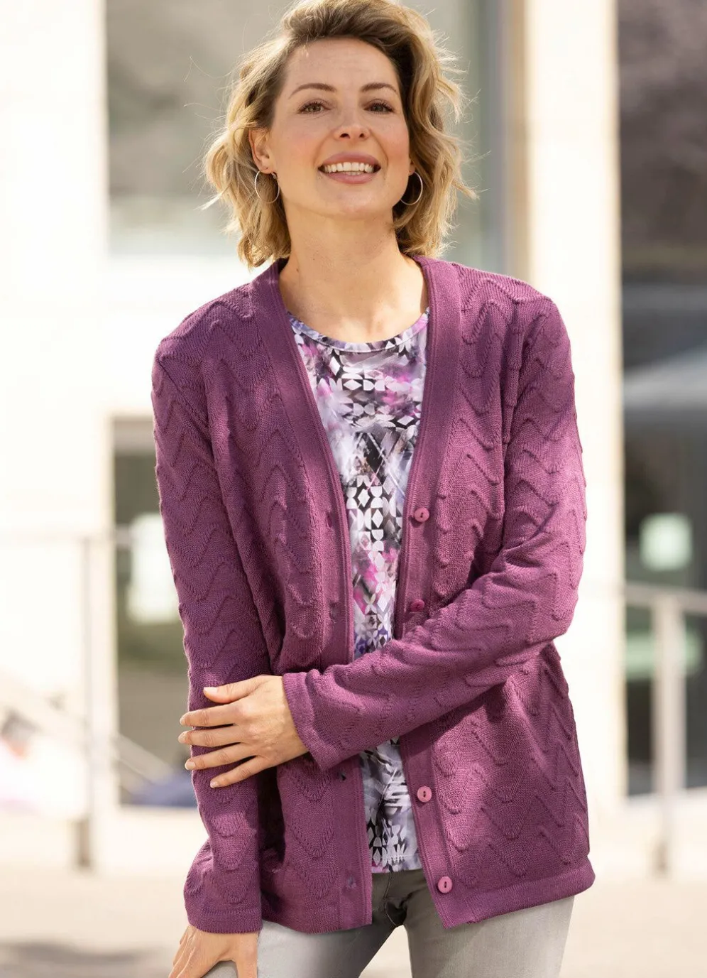 Durchgeknöpfte Strickjacke in Mauve, mit streckendem V-Ausschnitt, hübschem Strukturmuster im Zackendessin allover sowie langen Ärmeln.