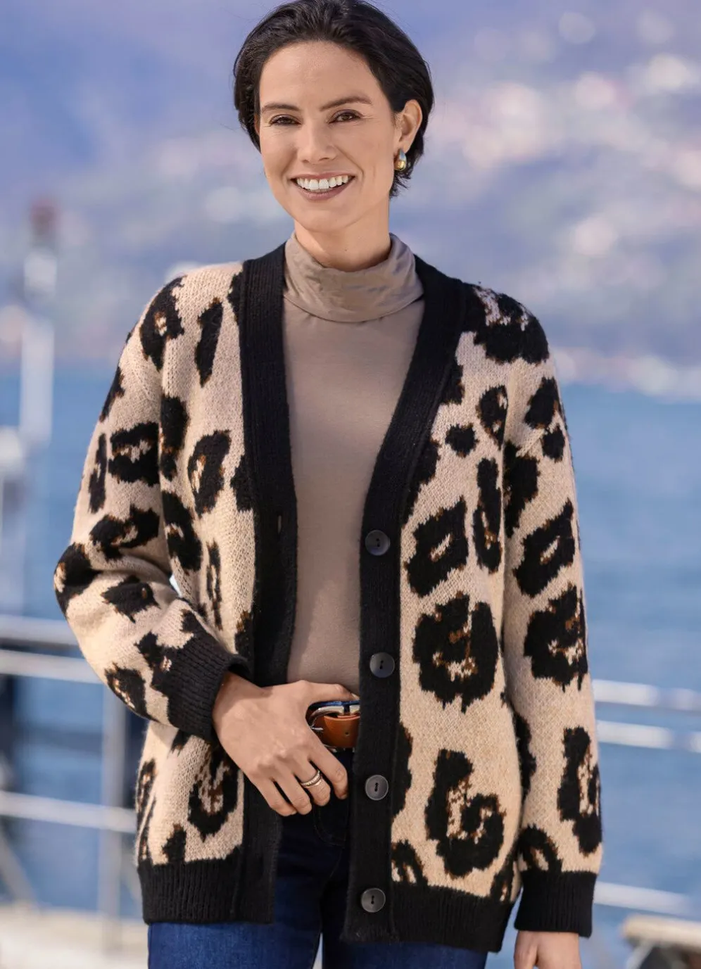 Fantastische, durchgeknöpfte Strickjacke von laurakent in Beige-Schwarz-Braun: flauschiger Griff, V-Ausschnitt, Jacquardmuster im Tierfelldessin allover, lange Ärmel, gerippte Kontrastabschlüsse.