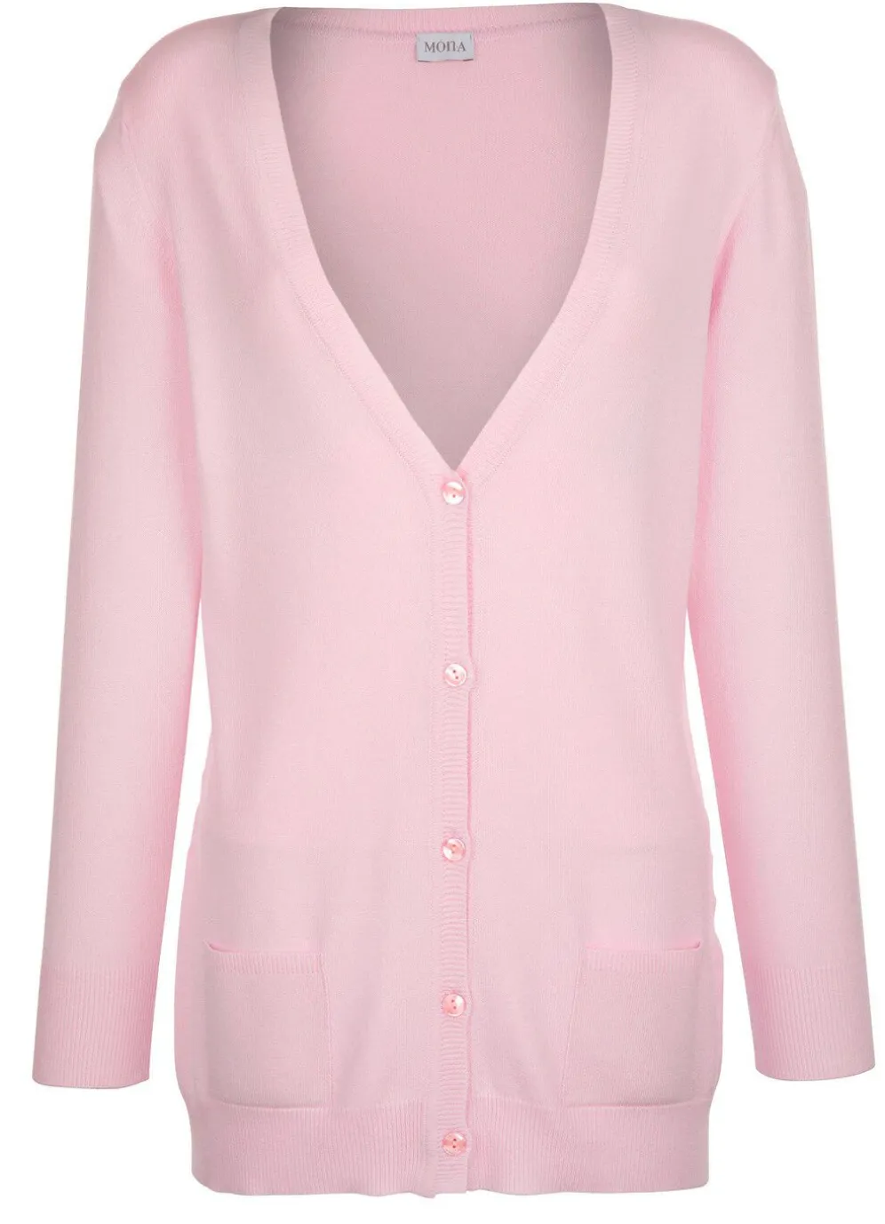 Durchgeknöpfte Strickjacke: V-Ausschnitt, weich fließend, lange Ärmel, feine Bündchen allover, 2 aufgesetzte Taschen.
