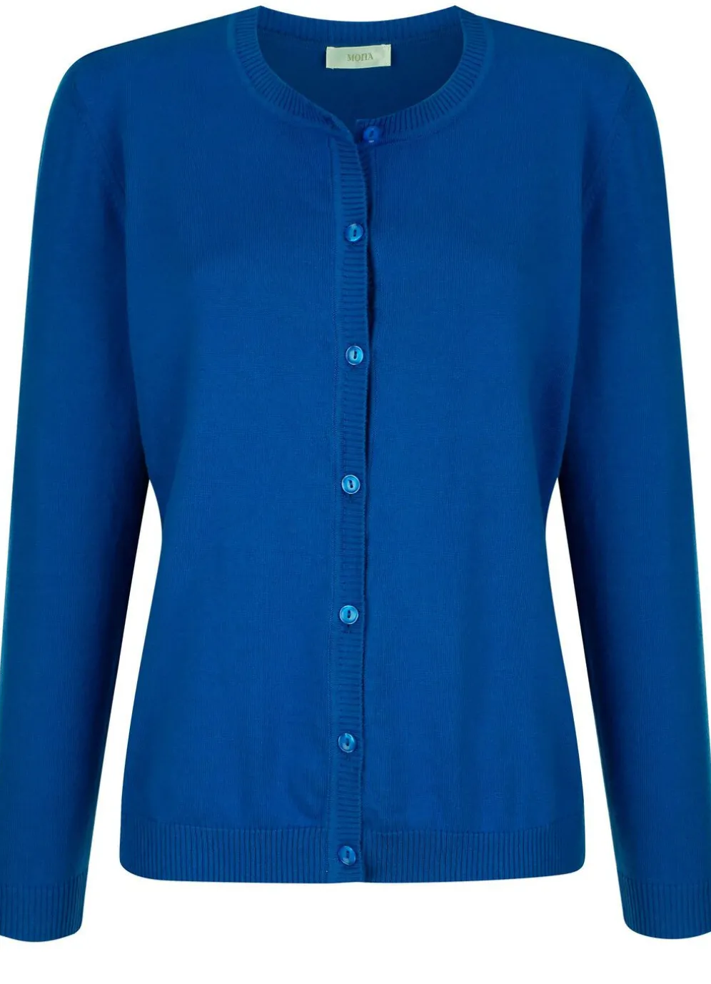 Aparte Strickjacke in durchgeknöpfter, leicht taillierter Form, mit rundem Halsausschnitt sowie Rippenbündchen an den langen Ärmeln.