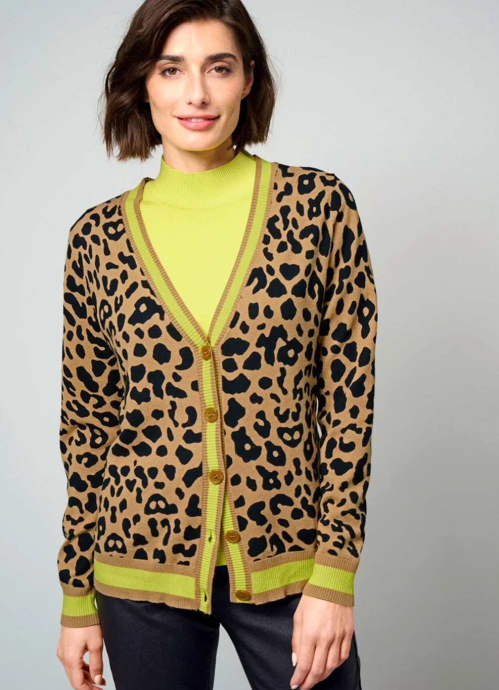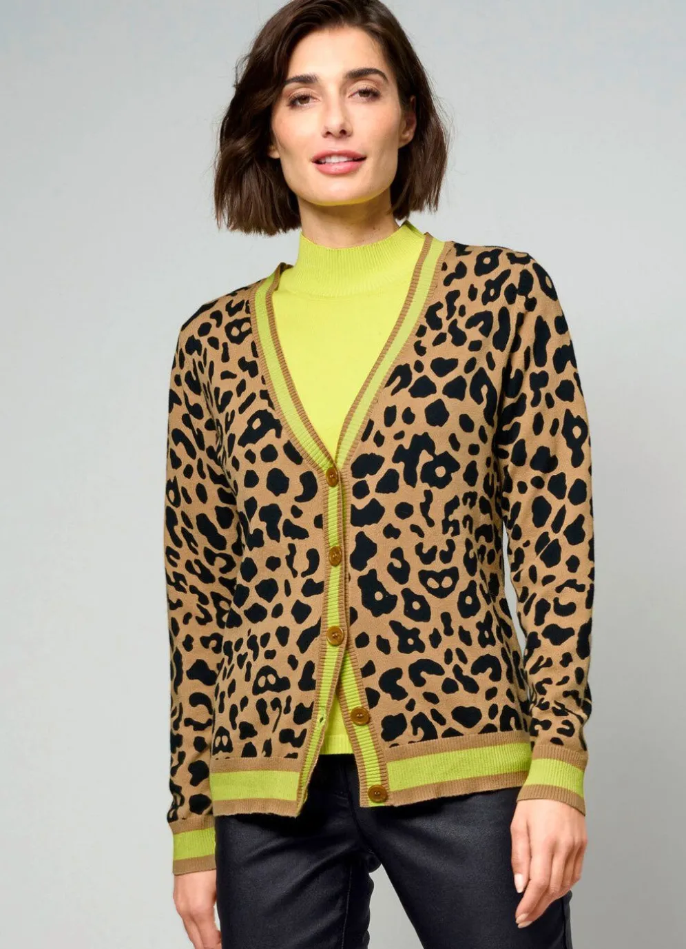 Leicht taillierte Strickjacke mit geringelten Abschlüssen. V-Ausschnitt, Knopfleiste sowie langen Ärmeln mit Rippenbündchen.