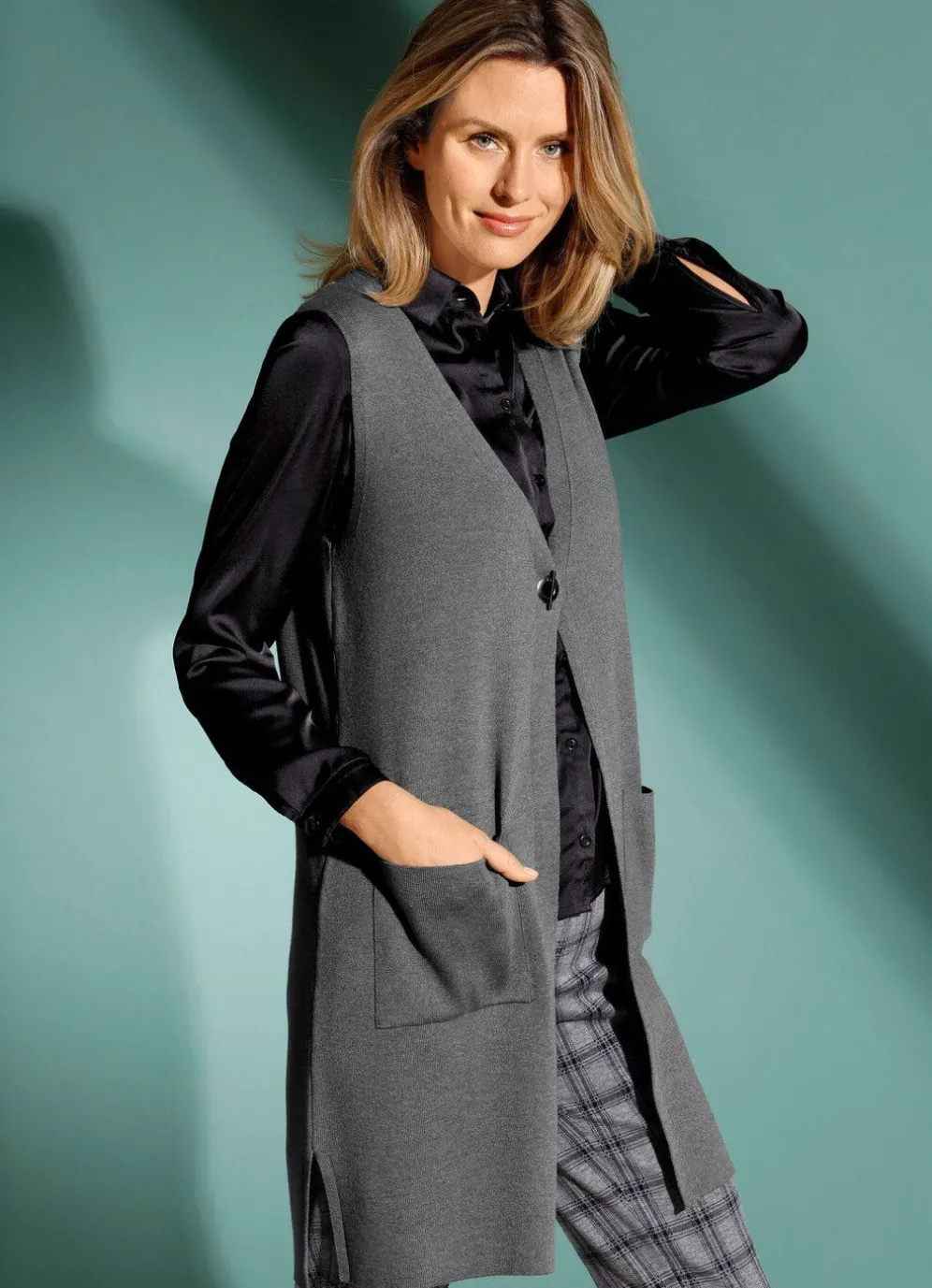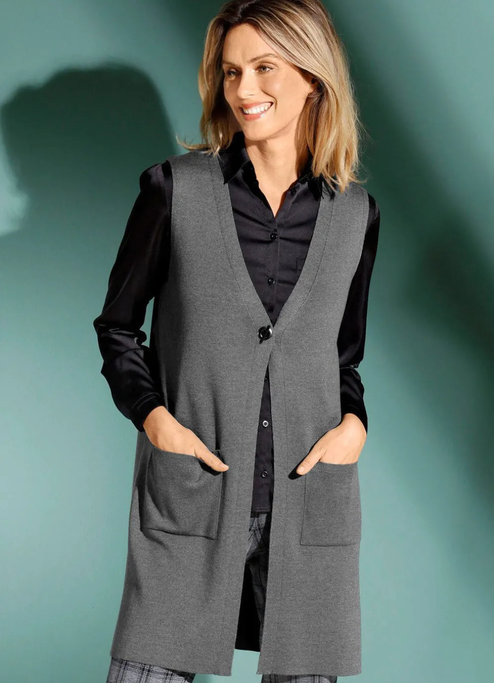 Tolle Strickweste in Longform mit V-Ausschnitt, dekorativem Verschluss, 2 aufgesetzten Taschen sowie Seitenschlitzen.